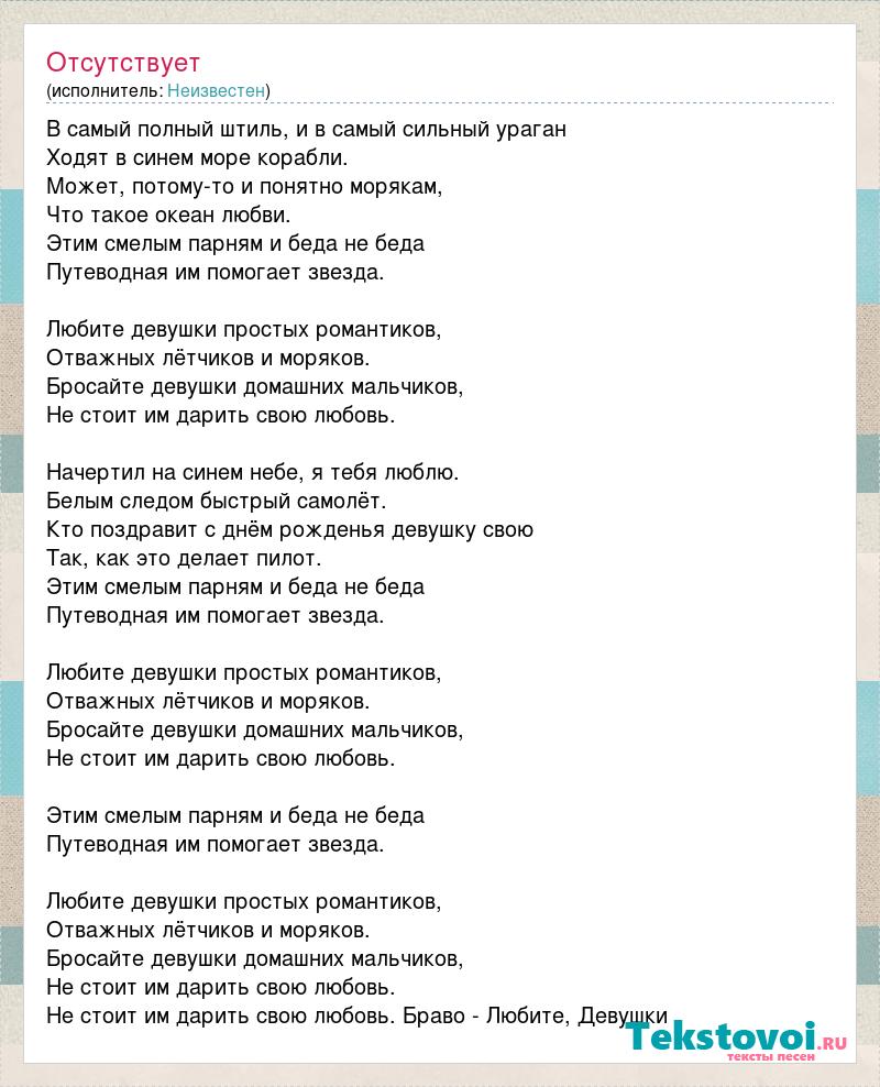 В самый полный штиль, и в самый сильный ураган Ходят в синем море корабли. Может, потому-то и понятно морякам, Что такое океан любви. Этим смелым парням и беда не беда Путеводная им помогает звезда. Любите девушки простых романтиков, Отважных лётчиков и моряков. Бросайте девушки домашних мальчиков, Не стоит им дарить свою любовь. Начертил на синем небе, я тебя люблю. Белым следом быстрый самолёт. Кто поздравит с днём рожденья девушку свою Так, как это делает пилот. Этим смелым парням и беда не беда Путеводная им помогает звезда. Любите девушки простых романтиков, Отважных лётчиков и моряков. Бросайте девушки домашних мальчиков, Не стоит им дарить свою любовь. Этим смелым парням и беда не беда Путеводная им помогает звезда. Любите девушки простых романтиков, Отважных лётчиков и моряков. Бросайте девушки домашних мальчиков, Не стоит им дарить свою любовь. Не стоит им дарить свою любовь. Браво - Любите, Девушки