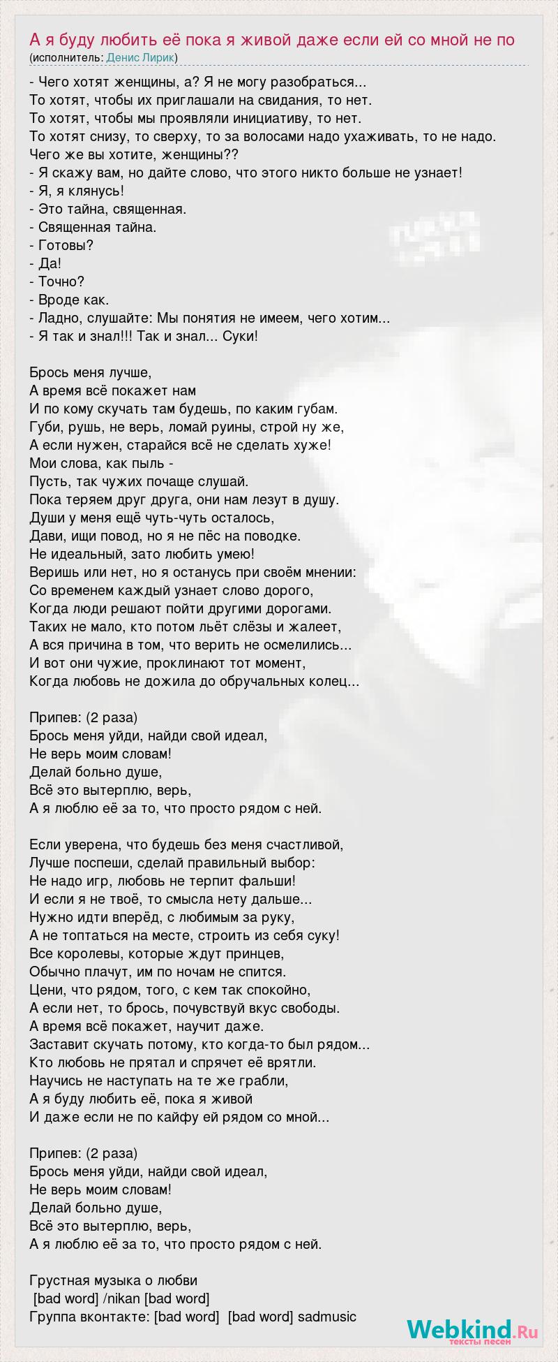 - Чего хотят женщины, а? Я не могу разобраться... То хотят, чтобы их приглашали на свидания, то нет. То хотят, чтобы мы проявляли инициативу, то нет. То хотят снизу, то сверху, то за волосами надо ухаживать, то не надо. Чего же вы хотите, женщины?? - Я скажу вам, но дайте слово, что этого никто больше не узнает! - Я, я клянусь! - Это тайна, священная. - Священная тайна. - Готовы? - Да! - Точно? - Вроде как. - Ладно, слушайте: Мы понятия не имеем, чего хотим... - Я так и знал!!! Так и знал... Суки! Брось меня лучше, А время всё покажет нам И по кому скучать там будешь, по каким губам. Губи, рушь, не верь, ломай руины, строй ну же, А если нужен, старайся всё не сделать хуже! Мои слова, как пыль - Пусть, так чужих почаще слушай. Пока теряем друг друга, они нам лезут в душу. Души у меня ещё чуть-чуть осталось, Дави, ищи повод, но я не пёс на поводке. Не идеальный, зато любить умею! Веришь или нет, но я останусь при своём мнении: Со временем каждый узнает слово дорого, Когда люди решают пойти другими дорогами. Таких не мало, кто потом льёт слёзы и жалеет, А вся причина в том, что верить не осмелились... И вот они чужие, проклинают тот момент, Когда любовь не дожила до обручальных колец... Припев: (2 раза) Брось меня уйди, найди свой идеал, Не верь моим словам! Делай больно душе, Всё это вытерплю, верь, А я люблю её за то, что просто рядом с ней. Если уверена, что будешь без меня счастливой, Лучше поспеши, сделай правильный выбор: Не надо игр, любовь не терпит фальши! И если я не твоё, то смысла нету дальше... Нужно идти вперёд, с любимым за руку, А не топтаться на месте, строить из себя суку! Все королевы, которые ждут принцев, Обычно плачут, им по ночам не спится. Цени, что рядом, того, с кем так спокойно, А если нет, то брось, почувствуй вкус свободы. А время всё покажет, научит даже. Заставит скучать потому, кто когда-то был рядом... Кто любовь не прятал и спрячет её врятли. Научись не наступать на те же грабли, А я буду любить её, пока я живой И даже если не по кайфу ей рядом со мной... Припев: (2 раза) Брось меня уйди, найди свой идеал, Не верь моим словам! Делай больно душе, Всё это вытерплю, верь, А я люблю её за то, что просто рядом с ней. Грустная музыка о любви [bad word] /nikan [bad word] Группа вконтакте: [bad word] [bad word] sadmusic