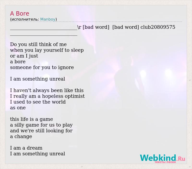 ____________________________\r [bad word] [bad word] club20809575 ____________________________ Do you still think of me when you lay yourself to sleep or am I just a bore someone for you to ignore I am something unreal I haven't always been like this I really am a hopeless optimist I used to see the world as one this life is a game a silly game for us to play and we're still looking for a change I am a dream I am something unreal