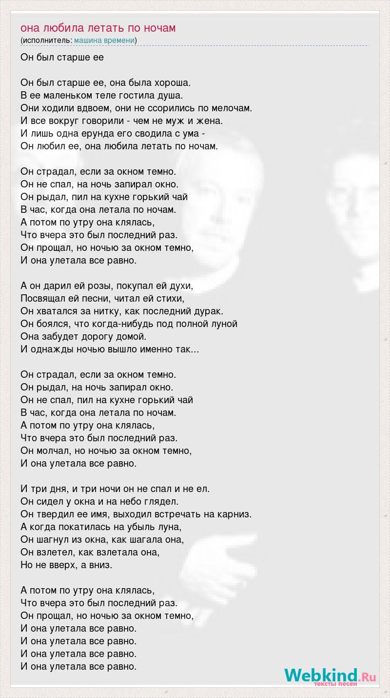 Он был старше ее Он был старше ее, она была хороша. В ее маленьком теле гостила душа. Они ходили вдвоем, они не ссорились по мелочам. И все вокруг говорили - чем не муж и жена. И лишь одна ерунда его сводила с ума - Он любил ее, она любила летать по ночам. Он страдал, если за окном темно. Он не спал, на ночь запирал окно. Он рыдал, пил на кухне горький чай В час, когда она летала по ночам. А потом по утру она клялась, Что вчера это был последний раз. Он прощал, но ночью за окном темно, И она улетала все равно. А он дарил ей розы, покупал ей духи, Посвящал ей песни, читал ей стихи, Он хватался за нитку, как последний дурак. Он боялся, что когда-нибудь под полной луной Она забудет дорогу домой. И однажды ночью вышло именно так... Он страдал, если за окном темно. Он рыдал, на ночь запирал окно. Он не спал, пил на кухне горький чай В час, когда она летала по ночам. А потом по утру она клялась, Что вчера это был последний раз. Он молчал, но ночью за окном темно, И она улетала все равно. И три дня, и три ночи он не спал и не ел. Он сидел у окна и на небо глядел. Он твердил ее имя, выходил встречать на карниз. А когда покатилась на убыль луна, Он шагнул из окна, как шагала она, Он взлетел, как взлетала она, Но не вверх, а вниз. А потом по утру она клялась, Что вчера это был последний раз. Он прощал, но ночью за окном темно, И она улетала все равно. И она улетала все равно. И она улетала все равно. И она улетала все равно.