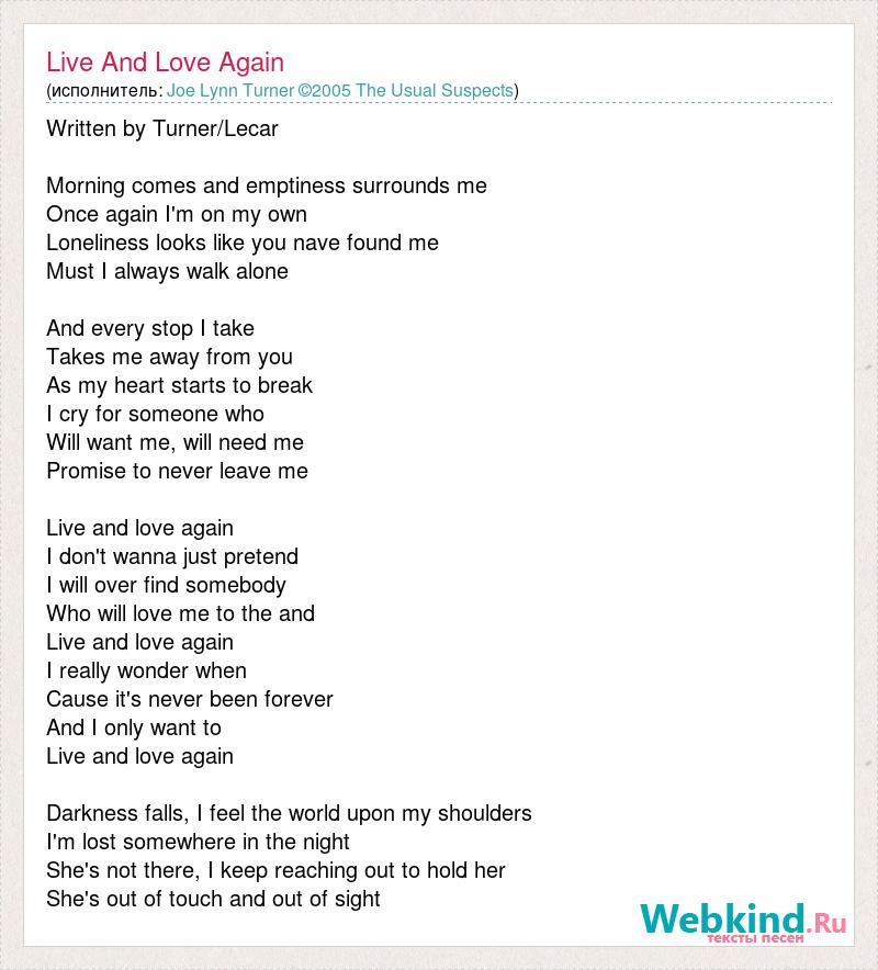 Written by Turner/Lecar Morning comes and emptiness surrounds me Once again I'm on my own Loneliness looks like you nave found me Must I always walk alone And every stop I take Takes me away from you As my heart starts to break I cry for someone who Will want me, will need me Promise to never leave me Live and love again I don't wanna just pretend I will over find somebody Who will love me to the and Live and love again I really wonder when Cause it's never been forever And I only want to Live and love again Darkness falls, I feel the world upon my shoulders I'm lost somewhere in the night She's not there, I keep reaching out to hold her She's out of touch and out of sight