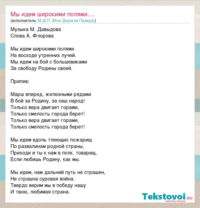 Музыка М. Давыдова Слова А. Флорова Мы идем широкими полями На восходе утренних лучей. Мы идем на бой с большевиками За свободу Родины своей. Припев: Марш вперед, железными рядами В бой за Родину, за наш народ! Только вера двигает горами, Только смелость города берет! Только вера двигает горами, Только смелость города берет! Мы идем вдоль тлеющих пожарищ По развалинам родной страны, Приходи и ты к нам в полк, товарищ, Если любишь Родину, как мы. Мы идем, нам дальний путь не страшен, Не страшна суровая война. Твердо верим мы в победу нашу И твою, любимая страна.