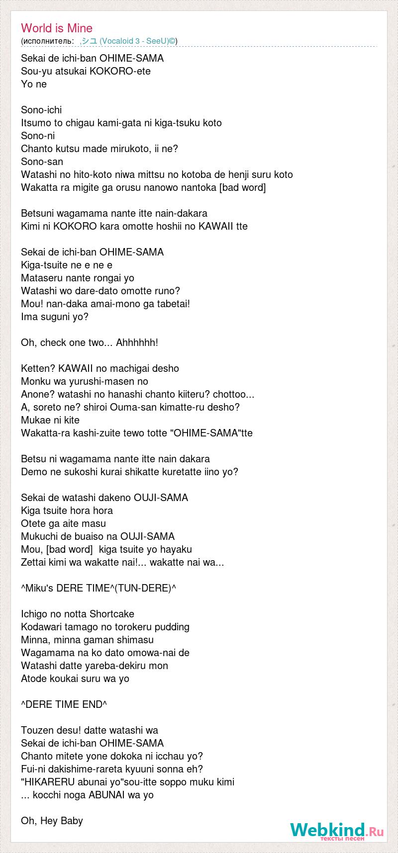 Sekai de ichi-ban OHIME-SAMA Sou-yu atsukai KOKORO-ete Yo ne Sono-ichi Itsumo to chigau kami-gata ni kiga-tsuku koto Sono-ni Chanto kutsu made mirukoto, ii ne? Sono-san Watashi no hito-koto niwa mittsu no kotoba de henji suru koto Wakatta ra migite ga orusu nanowo nantoka [bad word] Betsuni wagamama nante itte nain-dakara Kimi ni KOKORO kara omotte hoshii no KAWAII tte Sekai de ichi-ban OHIME-SAMA Kiga-tsuite ne e ne e Mataseru nante rongai yo Watashi wo dare-dato omotte runo? Mou! nan-daka amai-mono ga tabetai! Ima suguni yo? Oh, check one two... Ahhhhhh! Ketten? KAWAII no machigai desho Monku wa yurushi-masen no Anone? watashi no hanashi chanto kiiteru? chottoo... A, soreto ne? shiroi Ouma-san kimatte-ru desho? Mukae ni kite Wakatta-ra kashi-zuite tewo totte "OHIME-SAMA"tte Betsu ni wagamama nante itte nain dakara Demo ne sukoshi kurai shikatte kuretatte iino yo? Sekai de watashi dakeno OUJI-SAMA Kiga tsuite hora hora Otete ga aite masu Mukuchi de buaiso na OUJI-SAMA Mou, [bad word] kiga tsuite yo hayaku Zettai kimi wa wakatte nai!... wakatte nai wa... ^Miku's DERE TIME^(TUN-DERE)^ Ichigo no notta Shortcake Kodawari tamago no torokeru pudding Minna, minna gaman shimasu Wagamama na ko dato omowa-nai de Watashi datte yareba-dekiru mon Atode koukai suru wa yo ^DERE TIME END^ Touzen desu! datte watashi wa Sekai de ichi-ban OHIME-SAMA Chanto mitete yone dokoka ni icchau yo? Fui-ni dakishime-rareta kyuuni sonna eh? "HIKARERU abunai yo"sou-itte soppo muku kimi ... kocchi noga ABUNAI wa yo Oh, Hey Baby
