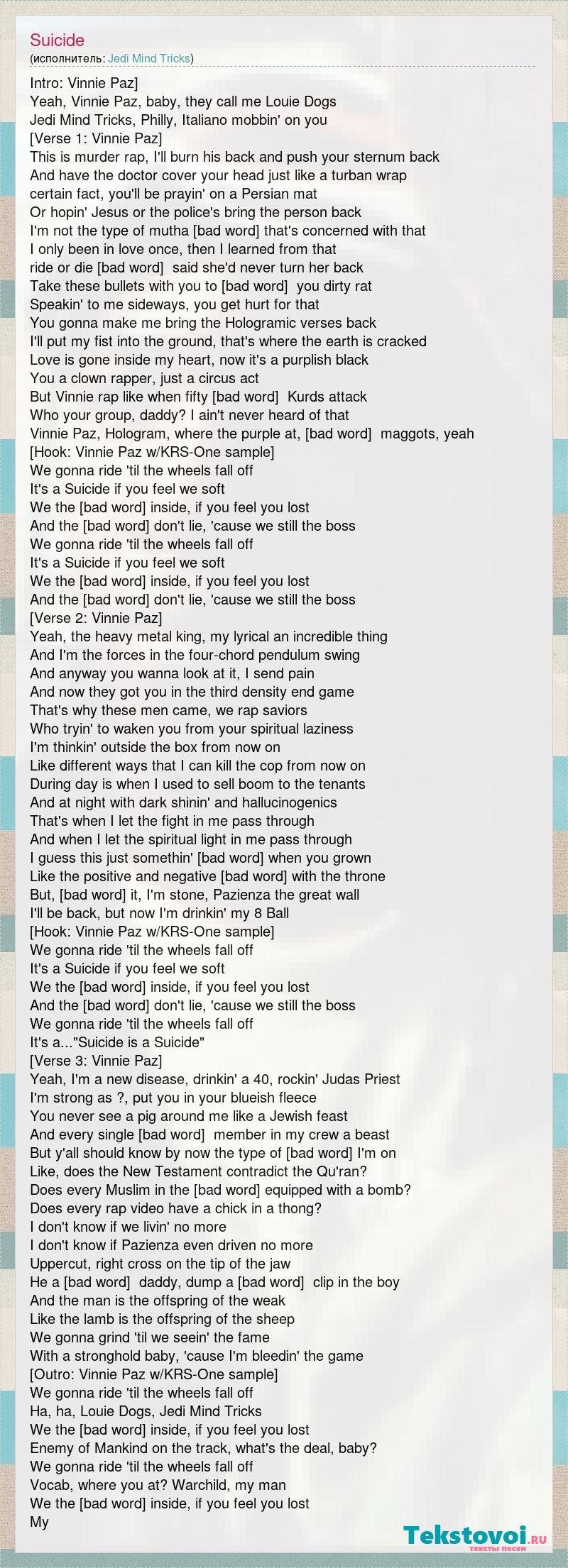 Intro: Vinnie Paz] Yeah, Vinnie Paz, baby, they call me Louie Dogs Jedi Mind Tricks, Philly, Italiano mobbin' on you [Verse 1: Vinnie Paz] This is murder rap, I'll burn his back and push your sternum back And have the doctor cover your head just like a turban wrap certain fact, you'll be prayin' on a Persian mat Or hopin' Jesus or the police's bring the person back I'm not the type of mutha [bad word] that's concerned with that I only been in love once, then I learned from that ride or die [bad word] said she'd never turn her back Take these bullets with you to Hell, you dirty rat Speakin' to me sideways, you get hurt for that You gonna make me bring the Hologramic verses back I'll put my fist into the ground, that's where the earth is cracked Love is gone inside my heart, now it's a purplish black You a clown rapper, just a circus act But Vinnie rap like when fifty [bad word] Kurds attack Who your group, daddy? I ain't never heard of that Vinnie Paz, Hologram, where the purple at, [bad word] maggots, yeah [Hook: Vinnie Paz w/KRS-One sample] We gonna ride 'til the wheels fall off It's a Suicide if you feel we soft We the truth inside, if you feel you lost And the truth don't lie, 'cause we still the boss We gonna ride 'til the wheels fall off It's a Suicide if you feel we soft We the truth inside, if you feel you lost And the truth don't lie, 'cause we still the boss [Verse 2: Vinnie Paz] Yeah, the heavy metal king, my lyrical an incredible thing And I'm the forces in the four-chord pendulum swing And anyway you wanna look at it, I send pain And now they got you in the third density end game That's why these men came, we rap saviors Who tryin' to waken you from your spiritual laziness I'm thinkin' outside the box from now on Like different ways that I can kill the cop from now on During day is when I used to sell boom to the tenants And at night with dark shinin' and hallucinogenics That's when I let the fight in me pass through And when I let the spiritual light in me pass through I guess this just somethin' that come when you grown Like the positive and negative that come with the throne But, [bad word] it, I'm stone, Pazienza the great wall I'll be back, but now I'm drinkin' my 8 Ball [Hook: Vinnie Paz w/KRS-One sample] We gonna ride 'til the wheels fall off It's a Suicide if you feel we soft We the truth inside, if you feel you lost And the truth don't lie, 'cause we still the boss We gonna ride 'til the wheels fall off It's a..."Suicide is a Suicide" [Verse 3: Vinnie Paz] Yeah, I'm a new disease, drinkin' a 40, rockin' Judas Priest I'm strong as ?, put you in your blueish fleece You never see a pig around me like a Jewish feast And every single [bad word] member in my crew a beast But y'all should know by now the type of [bad word] I'm on Like, does the New Testament contradict the Qu'ran? Does every Muslim in the world come equipped with a bomb? Does every rap video have a chick in a thong? I don't know if we livin' no more I don't know if Pazienza even driven no more Uppercut, right cross on the tip of the jaw He a crumb, daddy, dump a [bad word] clip in the boy And the man is the offspring of the weak Like the lamb is the offspring of the sheep We gonna grind 'til we seein' the fame With a stronghold baby, 'cause I'm bleedin' the game [Outro: Vinnie Paz w/KRS-One sample] We gonna ride 'til the wheels fall off Ha, ha, Louie Dogs, Jedi Mind Tricks We the truth inside, if you feel you lost Enemy of Mankind on the track, what's the deal, baby? We gonna ride 'til the wheels fall off Vocab, where you at? Warchild, my man We the truth inside, if you feel you lost My