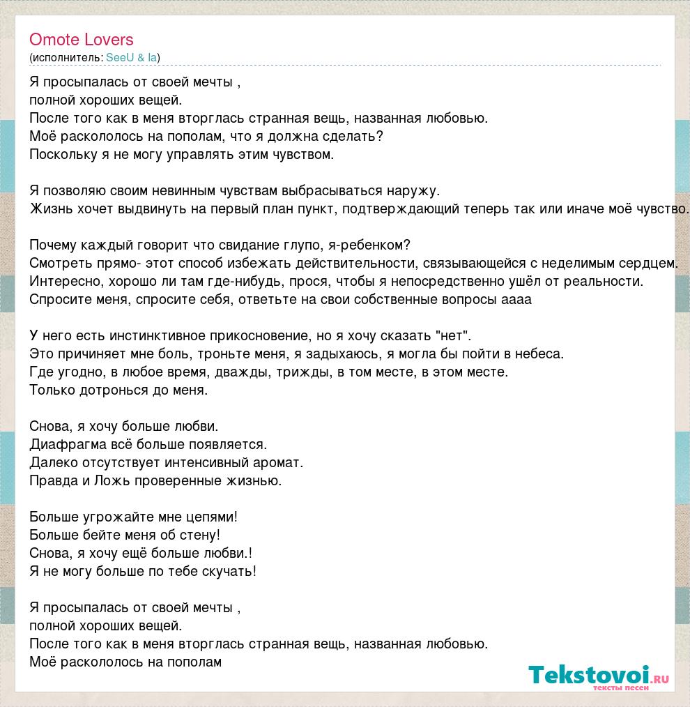 Я просыпалась от своей мечты , полной хороших вещей. После того как в меня вторглась странная вещь, названная любовью. Моё раскололось на пополам, что я должна сделать? Поскольку я не могу управлять этим чувством. Я позволяю своим невинным чувствам выбрасываться наружу. Жизнь хочет выдвинуть на первый план пункт, подтверждающий теперь так или иначе моё чувство. Почему каждый говорит что свидание глупо, я-ребенком? Смотреть прямо- этот способ избежать действительности, связывающейся с неделимым сердцем. Интересно, хорошо ли там где-нибудь, прося, чтобы я непосредственно ушёл от реальности. Спросите меня, спросите себя, ответьте на свои собственные вопросы aaaa У него есть инстинктивное прикосновение, но я хочу сказать "нет". Это причиняет мне боль, троньте меня, я задыхаюсь, я могла бы пойти в небеса. Где угодно, в любое время, дважды, трижды, в том месте, в этом месте. Только дотронься до меня. Снова, я хочу больше любви. Диафрагма всё больше появляется. Далеко отсутствует интенсивный аромат. Правда и Ложь проверенные жизнью. Больше угрожайте мне цепями! Больше бейте меня об стену! Снова, я хочу ещё больше любви.! Я не могу больше по тебе скучать! Я просыпалась от своей мечты , полной хороших вещей. После того как в меня вторглась странная вещь, названная любовью. Моё раскололось на пополам