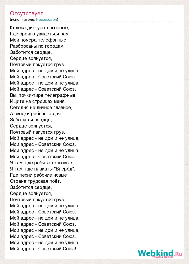 Колёса диктуют вагонные, Где срочно увидеться нам. Мои номера телефонные Разбросаны по городам. Заботится сердце, Сердце волнуется, Почтовый пакуется груз. Мой адрес - не дом и не улица, Мой адрес - Советский Союз. Мой адрес - не дом и не улица. Мой адрес - Советский Союз. Вы, точки-тире телеграфные, Ищите на стройках меня. Сегодня не личное главное, А сводки рабочего дня. Заботится сердце, Сердце волнуется, Почтовый пакуется груз. Мой адрес - не дом и не улица, Мой адрес - Советский Союз. Мой адрес - не дом и не улица, Мой адрес - Советский Союз. Я там, где ребята толковые, Я там, где плакаты "Вперёд", Где песни рабочие новые Страна трудовая поёт. Заботится сердце, Сердце волнуется, Почтовый пакуется груз. Мой адрес - не дом и не улица, Мой адрес - Советский Союз. Мой адрес - не дом и не улица, Мой адрес - Советский Союз. Мой адрес - не дом и не улица, Мой адрес - Советский Союз. Мой адрес - не дом и не улица, Мой адрес - Советский Союз!