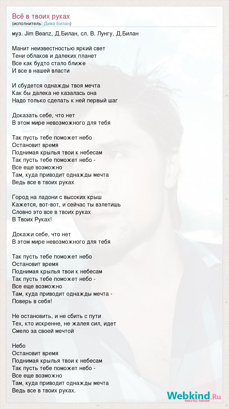 муз. Jim Beanz, Д.Билан, сл. В. Лунгу, Д.Билан Манит неизвестностью яркий свет Тени облаков и далеких планет Все как будто стало ближе И все в нашей власти И сбудется однажды твоя мечта Как бы далека не казалась она Надо только сделать к ней первый шаг Доказать себе, что нет В этом мире невозможного для тебя Так пусть тебе поможет небо Остановит время Поднимая крылья твои к небесам Так пусть тебе поможет небо - Все еще возможно Там, куда приводит однажды мечта Ведь все в твоих руках Город на ладони с высоких крыш Кажется, вот-вот, и сейчас ты взлетишь Словно это все в твоих руках В Твоих Руках! Докажи себе, что нет В этом мире невозможного для тебя Так пусть тебе поможет небо Остановит время Поднимая крылья твои к небесам Так пусть тебе поможет небо - Все еще возможно Там, куда приводит однажды мечта - Поверь в себя! Не остановить, и не сбить с пути Тех, кто искренне, не жалея сил, идет Смело за своей мечтой Небо Остановит время Поднимая крылья твои к небесам Так пусть тебе поможет небо - Все еще возможно Там, куда приводит однажды мечта Ведь все в твоих руках.