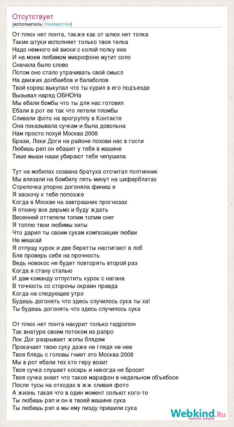 От плюх нет понта, также как от шлюх нет толка Такие штуки исполняет только твоя телка Надо немного ей виски с колой полку еее И на моем любимом микрофоне мутит соло Сначала было слово Потом оно стало утрачивать свой смысл На движих долбаебов и балаболов Твой кореш выкупал что ты курил в его подъезде Вызывал наряд ОБНОНа Мы ебали бомбы что ты для нас готовил Ебали в рот ее так что летели пломбы Сливали фото на эрогруппу в Контакте Она показывала сучкам и была довольна Нам просто похуй Москва 2008 Брази, Локи Доги на районе позови нас в гости Любишь реп он ебашит у тебя в машине Тише мыши наши убирают тебя чепушила Тут на мобилах созвана братуха отсчитал полтинник Мы влезали на бомбилу пять минут на циферблатах Стрелочка упорно догоняла финиш е Я заскочу к тебе попозже Когда в Москве на завтрашних прогнозах Я откину все дерьмо и буду ждать Весенней оттепели топим топим снег Я топлю твои любимы хиты Что дарил ты своим сукам композиции любви Не мешкай Я отпущу курок и две беретты настигают в лоб Бля проверь себя на прочность Ведь новокос не будет повторять второй раз Когда я стану сталью И дам команду отпустить курок с нагана В точность со стороны окраин правда Когда на следующее утро Будешь догонять что здесь случилось сука ты ха! Ты будешь догонять что здесь случилось сука От плюх нет понта накурит только гидропон Так внатуре своим потоком из рапро Лок Дог разрывает жопы блядям Прокачает твою суку даже не глядя не нее Твоя блядь с головы гниет это Москва 2008 Мы в рот ебали тех кто геру возит Твоя сучка слушает косарь и никогда не бросит Твоя сучка знает что такое марафон в недельном объебосе После тусы на отходах в жж сливая фото А жизнь такая что в один момент сольют кого-то Ты любишь рэп и он в твоей машине сука Ты любишь рэп а мы ему пизду пришили сука