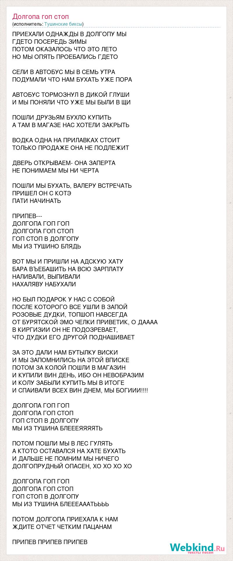 ПРИЕХАЛИ ОДНАЖДЫ В ДОЛГОПУ МЫ ГДЕТО ПОСЕРЕДЬ ЗИМЫ ПОТОМ ОКАЗАЛОСЬ ЧТО ЭТО ЛЕТО НО МЫ ОПЯТЬ ПРОЕБАЛИСЬ ГДЕТО СЕЛИ В АВТОБУС МЫ В СЕМЬ УТРА ПОДУМАЛИ ЧТО НАМ БУХАТЬ УЖЕ ПОРА АВТОБУС ТОРМОЗНУЛ В ДИКОЙ ГЛУШИ И МЫ ПОНЯЛИ ЧТО УЖЕ МЫ БЫЛИ В ЩИ ПОШЛИ ДРУЗЬЯМ БУХЛО КУПИТЬ А ТАМ В МАГАЗЕ НАС ХОТЕЛИ ЗАКРЫТЬ ВОДКА ОДНА НА ПРИЛАВКАХ СТОИТ ТОЛЬКО ПРОДАЖЕ ОНА НЕ ПОДЛЕЖИТ ДВЕРЬ ОТКРЫВАЕМ- ОНА ЗАПЕРТА НЕ ПОНИМАЕМ МЫ НИ ЧЕРТА ПОШЛИ МЫ БУХАТЬ, ВАЛЕРУ ВСТРЕЧАТЬ ПРИШЕЛ ОН С КОТЭ ПАТИ НАЧИНАТЬ ПРИПЕВ--- ДОЛГОПА ГОП ГОП ДОЛГОПА ГОП СТОП ГОП СТОП В ДОЛГОПУ МЫ ИЗ ТУШИНО БЛЯДЬ ВОТ МЫ И ПРИШЛИ НА АДСКУЮ ХАТУ БАРА ВЪЕБАШИТЬ НА ВСЮ ЗАРПЛАТУ НАЛИВАЛИ, ВЫПИВАЛИ НАХАЛЯВУ НАБУХАЛИ НО БЫЛ ПОДАРОК У НАС С СОБОЙ ПОСЛЕ КОТОРОГО ВСЕ УШЛИ В ЗАПОЙ РОЗОВЫЕ ДУДКИ, ТОПШОП НАВСЕГДА ОТ БУРЯТСКОЙ ЭМО ЧЕЛКИ ПРИВЕТИК, О ДАААА В КИРГИЗИИ ОН НЕ ПОДОЗРЕВАЕТ, ЧТО ДУДКИ ЕГО ДРУГОЙ ПОДНАШИВАЕТ ЗА ЭТО ДАЛИ НАМ БУТЫЛКУ ВИСКИ И МЫ ЗАПОМНИЛИСЬ НА ЭТОЙ ВПИСКЕ ПОТОМ ЗА КОЛОЙ ПОШЛИ В МАГАЗИН И КУПИЛИ ВИН ДЕНЬ, ИБО ОН НЕВОБРАЗИМ И КОЛУ ЗАБЫЛИ КУПИТЬ МЫ В ИТОГЕ И СПАИВАЛИ ВСЕХ ВИН ДНЕМ, МЫ БОГИИИ!!!! ДОЛГОПА ГОП ГОП ДОЛГОПА ГОП СТОП ГОП СТОП В ДОЛГОПУ МЫ ИЗ ТУШИНА БЛЕЕЕЯЯЯЯТЬ ПОТОМ ПОШЛИ МЫ В ЛЕС ГУЛЯТЬ А КТОТО ОСТАВАЛСЯ НА ХАТЕ БУХАТЬ И ДАЛЬШЕ НЕ ПОМНИМ МЫ НИЧЕГО ДОЛГОПРУДНЫЙ ОПАСЕН, ХО ХО ХО ХО ДОЛГОПА ГОП ГОП ДОЛГОПА ГОП СТОП ГОП СТОП В ДОЛГОПУ МЫ ИЗ ТУШИНА БЛЕЕЕАААТЬЬЬЬ ПОТОМ ДОЛГОПА ПРИЕХАЛА К НАМ ЖДИТЕ ОТЧЕТ ЧЕТКИМ ПАЦАНАМ ПРИПЕВ ПРИПЕВ ПРИПЕВ