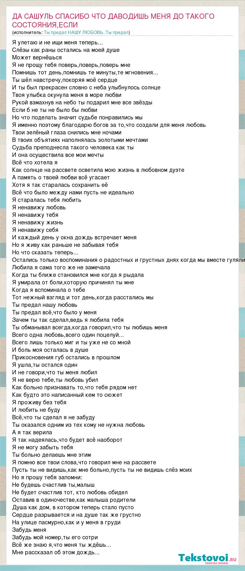Главная→Исполнители→Ты предал НАШУ ЛЮБОВЬ..Ты предал ВСЁ,что БЫЛО У МЕНЯ..Зачем ты так сделал,ВЕДЬ Я ЛЮБЛЮ ТЕБЯ..Ты обманываешь ВСЕГДА..*→ДА САШУЛЬ СПАСИБО ЧТО ДАВОДИШЬ МЕНЯ ДО ТАКОГО СОСТОЯНИЯ,ЕСЛИ И ДАЛЬШЕ