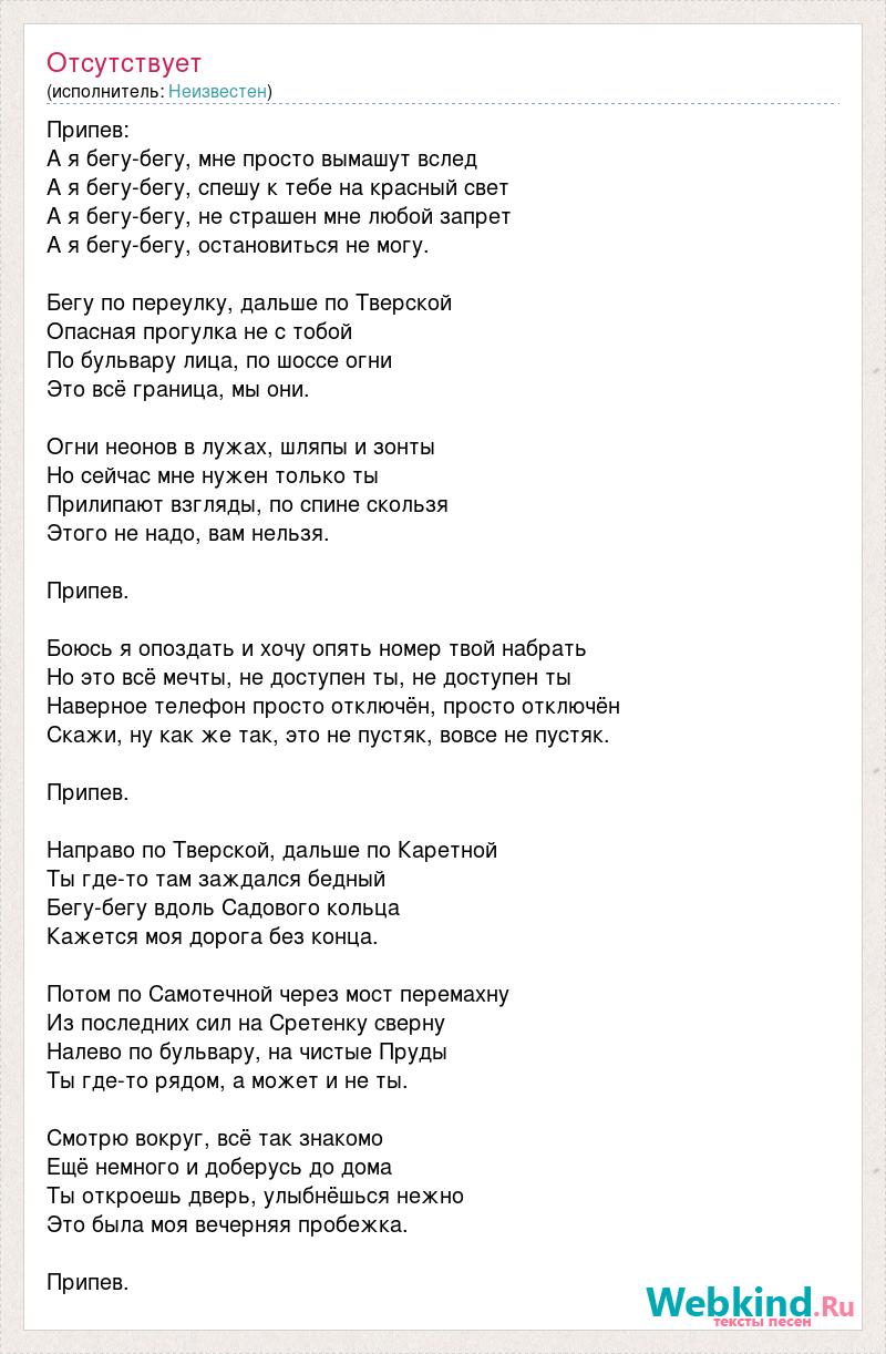 Припев: А я бегу-бегу, мне просто вымашут вслед А я бегу-бегу, спешу к тебе на красный свет А я бегу-бегу, не страшен мне любой запрет А я бегу-бегу, остановиться не могу. Бегу по переулку, дальше по Тверской Опасная прогулка не с тобой По бульвару лица, по шоссе огни Это всё граница, мы они. Огни неонов в лужах, шляпы и зонты Но сейчас мне нужен только ты Прилипают взгляды, по спине скользя Этого не надо, вам нельзя. Припев. Боюсь я опоздать и хочу опять номер твой набрать Но это всё мечты, не доступен ты, не доступен ты Наверное телефон просто отключён, просто отключён Скажи, ну как же так, это не пустяк, вовсе не пустяк. Припев. Направо по Тверской, дальше по Каретной Ты где-то там заждался бедный Бегу-бегу вдоль Садового кольца Кажется моя дорога без конца. Потом по Самотечной через мост перемахну Из последних сил на Сретенку сверну Налево по бульвару, на чистые Пруды Ты где-то рядом, а может и не ты. Смотрю вокруг, всё так знакомо Ещё немного и доберусь до дома Ты откроешь дверь, улыбнёшься нежно Это была моя вечерняя пробежка. Припев.