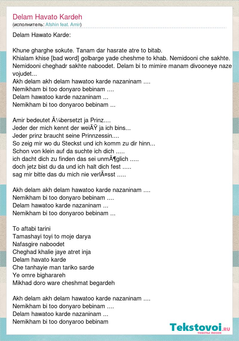 Delam Hawato Karde: Khune gharghe sokute. Tanam dar hasrate atre to bitab. Khialam khise shabnam ruye golbarge yade cheshme to khab. Nemidooni che sakhte. Nemidooni cheghadr sakhte naboodet. Delam bi to mimire manam divooneye naze vojudet... Akh delam akh delam hawatoo karde nazaninam .... Nemikham bi too donyaro bebinam .... Delam hawatoo karde nazaninam ... Nemikham bi too donyaroo bebinam ... Amir bedeutet übersetzt ja Prinz.... Jeder der mich kennt der weiß ja ich bins... Jeder prinz braucht seine Prinnzessin.... So zeig mir wo du Steckst und ich komm zu dir hinn... Schon von klein auf da suchte ich dich ..... ich dacht dich zu finden das sei unmöglich ..... doch jetz bist du da und ich halt dich fest ..... sag mir bitte das du mich nie verlässt ..... Akh delam akh delam hawatoo karde nazaninam .... Nemikham bi too donyaro bebinam .... Delam hawatoo karde nazaninam ... Nemikham bi too donyaroo bebinam ... To aftabi tarini Tamashayi toyi to moje darya Nafasgire naboodet Cheghad khalie jaye atret inja Delam havato karde Che tanhayie man tariko sarde Ye omre bigharareh Mikhad doro ware cheshmat begardeh Akh delam akh delam hawatoo karde nazaninam .... Nemikham bi too donyaro bebinam .... Delam hawatoo karde nazaninam ... Nemikham bi too donyaroo bebinam