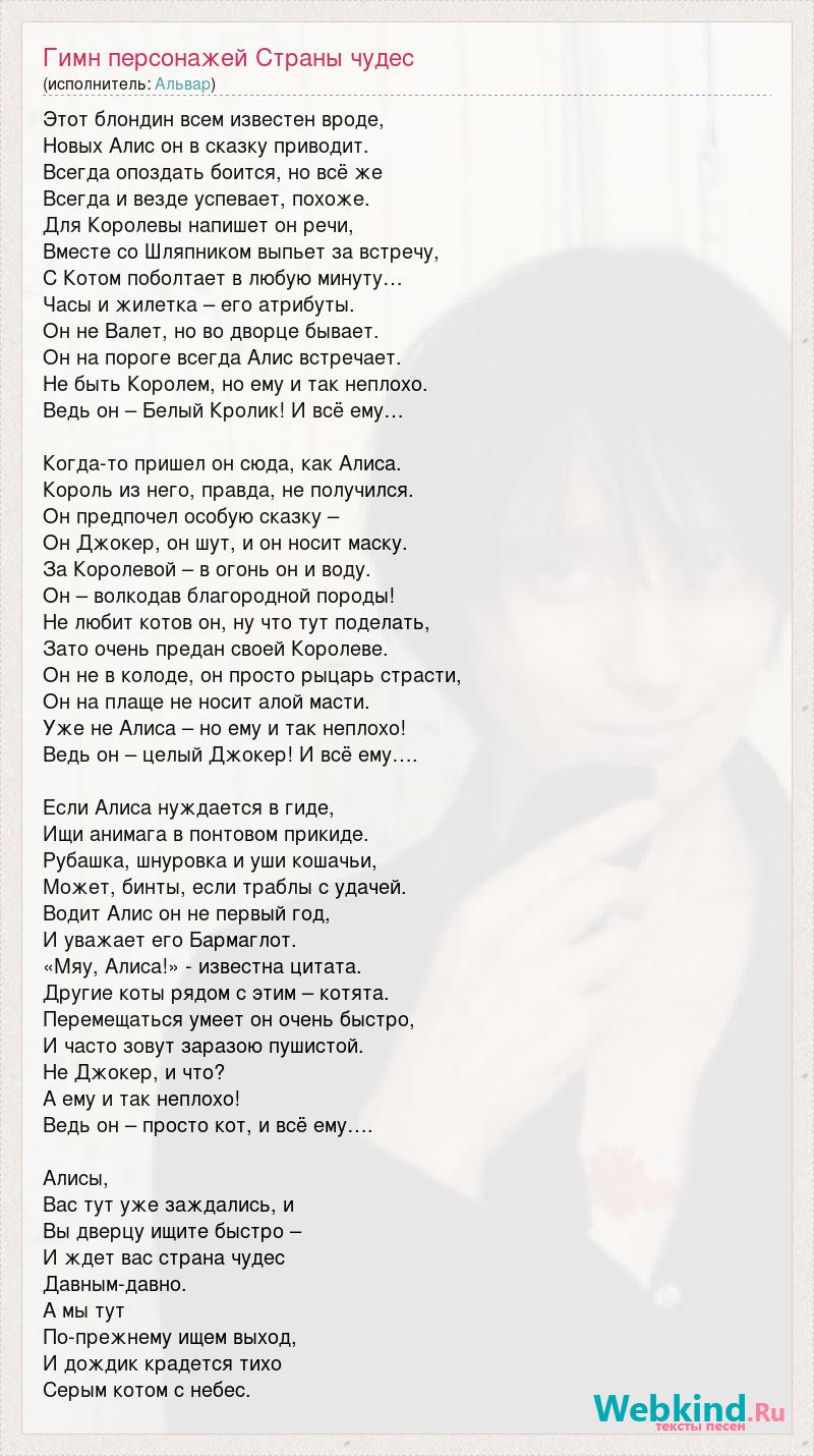 Этот блондин всем известен вроде, Новых Алис он в сказку приводит. Всегда опоздать боится, но всё же Всегда и везде успевает, похоже. Для Королевы напишет он речи, Вместе со Шляпником выпьет за встречу, С Котом поболтает в любую минуту… Часы и жилетка – его атрибуты. Он не Валет, но во дворце бывает. Он на пороге всегда Алис встречает. Не быть Королем, но ему и так неплохо. Ведь он – Белый Кролик! И всё ему… Когда-то пришел он сюда, как Алиса. Король из него, правда, не получился. Он предпочел особую сказку – Он Джокер, он шут, и он носит маску. За Королевой – в огонь он и воду. Он – волкодав благородной породы! Не любит котов он, ну что тут поделать, Зато очень предан своей Королеве. Он не в колоде, он просто рыцарь страсти, Он на плаще не носит алой масти. Уже не Алиса – но ему и так неплохо! Ведь он – целый Джокер! И всё ему…. Если Алиса нуждается в гиде, Ищи анимага в понтовом прикиде. Рубашка, шнуровка и уши кошачьи, Может, бинты, если траблы с удачей. Водит Алис он не первый год, И уважает его Бармаглот. «Мяу, Алиса!» - известна цитата. Другие коты рядом с этим – котята. Перемещаться умеет он очень быстро, И часто зовут заразою пушистой. Не Джокер, и что? А ему и так неплохо! Ведь он – просто кот, и всё ему…. Алисы, Вас тут уже заждались, и Вы дверцу ищите быстро – И ждет вас страна чудес Давным-давно. А мы тут По-прежнему ищем выход, И дождик крадется тихо Серым котом с небес.