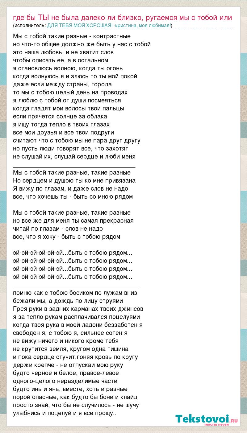 Мы с тобой такие разные - контрастные но что-то общее должно же быть у нас с тобой это наша любовь, и не хватит слов чтобы описать её, а в остальном я становлюсь волною, когда ты огонь когда волнуюсь я и злюсь то ты мой покой даже если между страны, города то мы с тобою целый день на проводах я люблю с тобой от души посмеяться когда гладят мои волосы твои пальцы если прячется солнце за облака я ищу тогда тепло в твоих глазах все мои друзья и все твои подруги считают что с тобою мы не пара друг другу но пусть люди говорят все, что захотят не слушай их, слушай сердце и люби меня ____________________________________ Мы с тобой такие разные, такие разные Но сердцем и душою ты ко мне привязана Я вижу по глазам, и даже слов не надо все, что хочешь ты - быть со мною рядом Мы с тобой такие разные, такие разные но все же для меня ты самая прекрасная читай по глазам - слов не надо все, что я хочу - быть с тобою рядом эй-эй-эй-эй-эй-эй...быть с тобою рядом... эй-эй-эй-эй-эй-эй...быть с тобою рядом... эй-эй-эй-эй-эй-эй...быть с тобою рядом... эй-эй-эй-эй-эй-эй...быть с тобою рядом... _____________________________________ помню как с тобою босиком по лужам вниз бежали мы, а дождь по лицу струями Грея руки в задних карманах твоих джинсов я за тепло рукам расплачивался поцелуями когда твоя рука в моей ладони беззаботен я свободен я, с тобою я, сильнее сотен я не вижу ничего и никого кроме тебя не крутится земля, кругом одна тишина и пока сердце стучит,гоняя кровь по кругу держи крепче - не отпускай мою руку будто черное и белое, правое-левое одного-целого неразделимые части будто инь и янь, вместе, хоть и разные порой опасные, как будто бы бони и клайд просто знай, что бы не случилось - не шучу улыбнись и поцелуй и я все прощу..