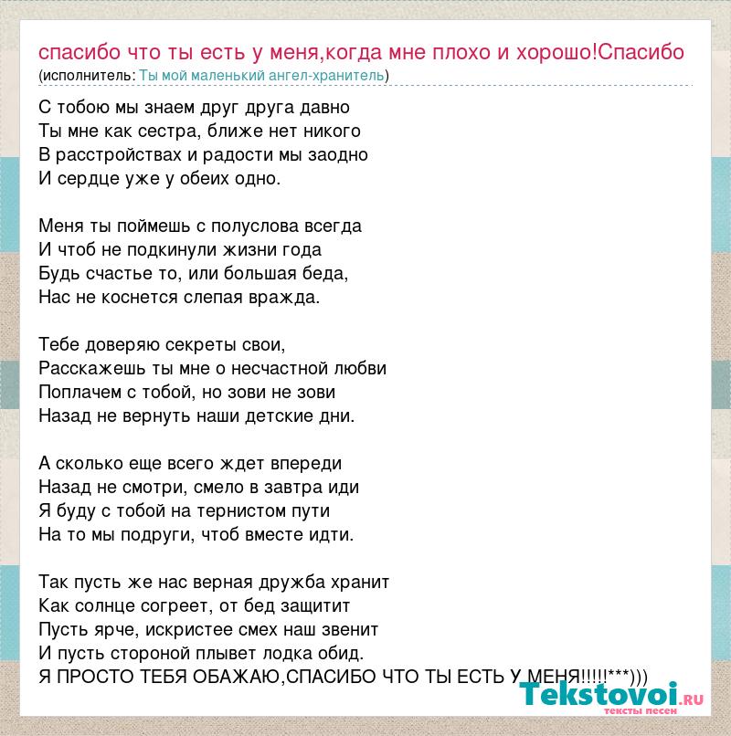 Главная→Исполнители→Ты мой маленький ангел-хранитель→Спасибо что ты есть у меня,когда мне плохо и хорошо!Спасибо тебе за то, что
