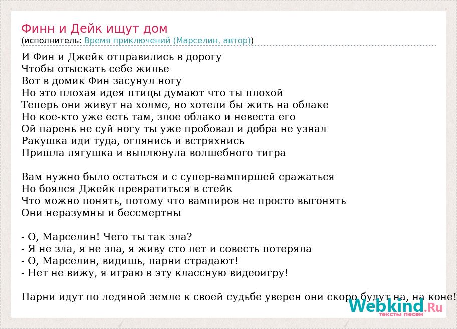 И Фин и Джейк отправились в дорогу Чтобы отыскать себе жилье Вот в домик Фин засунул ногу Но это плохая идея птицы думают что ты плохой Теперь они живут на холме, но хотели бы жить на облаке Но кое-кто уже есть там, злое облако и невеста его Ой парень не суй ногу ты уже пробовал и добра не узнал Ракушка иди туда, оглянись и встряхнись Пришла лягушка и выплюнула волшебного тигра Вам нужно было остаться и с супер-вампиршей сражаться Но боялся Джейк превратиться в стейк Что можно понять, потому что вампиров не просто выгонять Они неразумны и бессмертны - О, Марселин! Чего ты так зла? - Я не зла, я не зла, я живу сто лет и совесть потеряла - О, Марселин, видишь, парни страдают! - Нет не вижу, я играю в эту классную видеоигру! Парни идут по ледяной земле к своей судьбе уверен они скоро будут на, на коне!