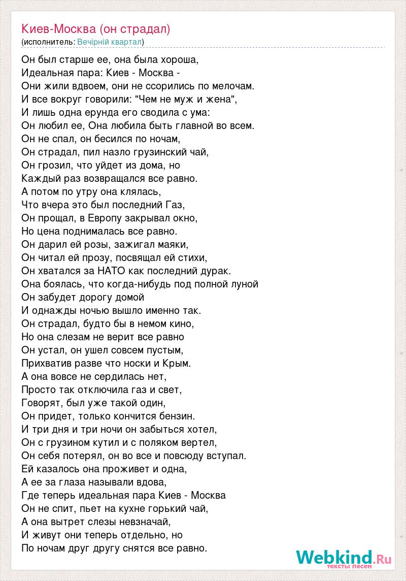 Он был старше ее, она была хороша, Идеальная пара: Киев - Москва - Они жили вдвоем, они не ссорились по мелочам. И все вокруг говорили: "Чем не муж и жена", И лишь одна ерунда его сводила с ума: Он любил ее, Она любила быть главной во всем. Он не спал, он бесился по ночам, Он страдал, пил назло грузинский чай, Он грозил, что уйдет из дома, но Каждый раз возвращался все равно. А потом по утру она клялась, Что вчера это был последний Газ, Он прощал, в Европу закрывал окно, Но цена поднималась все равно. Он дарил ей розы, зажигал маяки, Он читал ей прозу, посвящал ей стихи, Он хватался за НАТО как последний дурак. Она боялась, что когда-нибудь под полной луной Он забудет дорогу домой И однажды ночью вышло именно так. Он страдал, будто бы в немом кино, Но она слезам не верит все равно Он устал, он ушел совсем пустым, Прихватив разве что носки и Крым. А она вовсе не сердилась нет, Просто так отключила газ и свет, Говорят, был уже такой один, Он придет, только кончится бензин. И три дня и три ночи он забыться хотел, Он с грузином кутил и с поляком вертел, Он себя потерял, он во все и повсюду вступал. Ей казалось она проживет и одна, А ее за глаза называли вдова, Где теперь идеальная пара Киев - Москва Он не спит, пьет на кухне горький чай, А она вытрет слезы невзначай, И живут они теперь отдельно, но По ночам друг другу снятся все равно.