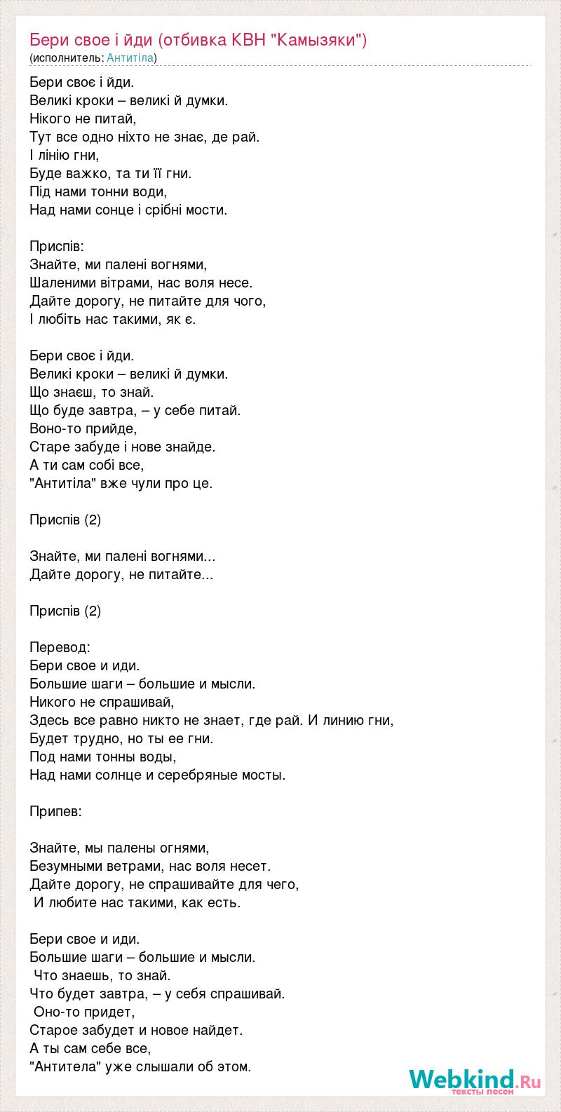 Бери своє і йди. Великі кроки – великі й думки. Нікого не питай, Тут все одно ніхто не знає, де рай. І лінію гни, Буде важко, та ти її гни. Під нами тонни води, Над нами сонце і срібні мости. Приспів: Знайте, ми палені вогнями, Шаленими вітрами, нас воля несе. Дайте дорогу, не питайте для чого, І любіть нас такими, як є. Бери своє і йди. Великі кроки – великі й думки. Що знаєш, то знай. Що буде завтра, – у себе питай. Воно-то прийде, Старе забуде і нове знайде. А ти сам собі все, "Антитіла" вже чули про це. Приспів (2) Знайте, ми палені вогнями... Дайте дорогу, не питайте... Приспів (2) Перевод: Бери свое и иди. Большие шаги – большие и мысли. Никого не спрашивай, Здесь все равно никто не знает, где рай. И линию гни, Будет трудно, но ты ее гни. Под нами тонны воды, Над нами солнце и серебряные мосты. Припев: Знайте, мы палены огнями, Безумными ветрами, нас воля несет. Дайте дорогу, не спрашивайте для чего, И любите нас такими, как есть. Бери свое и иди. Большие шаги – большие и мысли. Что знаешь, то знай. Что будет завтра, – у себя спрашивай. Оно-то придет, Старое забудет и новое найдет. А ты сам себе все, "Антитела" уже слышали об этом.