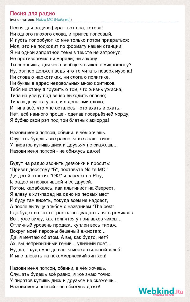 Песня для радиоэфира - вот она, готова! Ни одного плохого слова, и припев попсовый. И пусть попробуют ко мне только потом придраться: Мол, это не подходит по формату нашей станции! Я ни одной запретной темы в тексте не затронул, Не противоречил ни морали, ни закону: Ты спросишь, для чего вообще я вышел к микрофону? Ну, рэппер должен ведь что-то читать поверх музона! Ни слова о наркотиках, ни слога о политике, Ни буквы в адрес недовольных мною критиков. Тебя не стану я грузить о том, что жизнь ужасна, Типа на улицу под вечер выходить опасно; Типа и девушка ушла, и с деньгами плохо; И типа всё, что мне осталось - это ахать и охать. Нет, всё намного проще - сделав посерьёзней морду, Я бубню свой рэп под три блатных аккорда! Назови меня попсой, обвини, в чём хочешь. Слушать будешь всё равно, я же знаю точно. У пиратов купишь диск и друзьям не скажешь... Назови меня попсой - не обижусь даже! Будут на радио звонить девчонки и просить: "Привет десятому "Б", поставьте Noize MC!" Ди-джей ответит "ОК!" и нажмёт на Play, К радости позвонившей и её друзей. Потом, карабкаясь, как альпинист на Эверест, Я влезу в хит-парад на одно из первых мест И буду там висеть, покуда всем не надоест, А после выпущу альбом с названием "The best", Где будет вот этот трэк плюс двадцать пять ремиксов. Вот, уже вижу, как толпятся у прилавков чиксы... Отличный уровень продаж, куплен весь тираж, Вокруг моей персоны бешеный ажиотаж... Да, я мечтаю об этом. А вы, как будто, нет? Ах, вы непризнанный гений... уличный поэт... Ну, да, - куда мне до вас, я меркантильный жлоб. И мне плевать на некоммерческий хип-хоп! Назови меня попсой, обвини, в чём хочешь. Слушать будешь всё равно, я же знаю точно. У пиратов купишь диск и друзьям не скажешь... Назови меня попсой - не обижусь даже!
