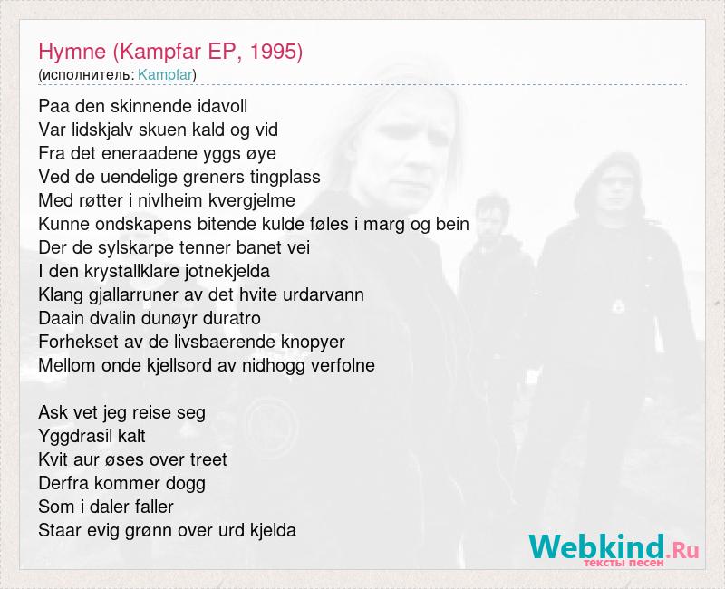 Paa den skinnende idavoll Var lidskjalv skuen kald og vid Fra det eneraadene yggs øye Ved de uendelige greners tingplass Med røtter i nivlheim kvergjelme Kunne ondskapens bitende kulde føles i marg og bein Der de sylskarpe tenner banet vei I den krystallklare jotnekjelda Klang gjallarruner av det hvite urdarvann Daain dvalin dunøyr duratro Forhekset av de livsbaerende knopyer Mellom onde kjellsord av nidhogg verfolne Ask vet jeg reise seg Yggdrasil kalt Kvit aur øses over treet Derfra kommer dogg Som i daler faller Staar evig grønn over urd kjelda