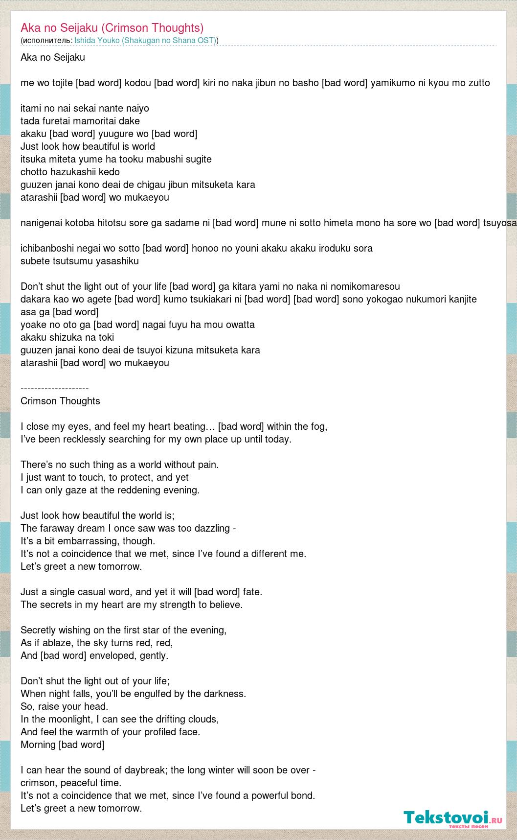 Aka no Seijaku me wo tojite kanjiru kodou mogaiteru kiri no naka jibun no basho [bad word] yamikumo ni kyou mo zutto itami no nai sekai nante naiyo tada furetai mamoritai dake akaku somaru yuugure wo mitsumeru Just look how beautiful is world itsuka miteta yume ha tooku mabushi sugite chotto hazukashii kedo guuzen janai kono deai de chigau jibun mitsuketa kara atarashii [bad word] wo mukaeyou nanigenai kotoba hitotsu sore ga sadame ni naru mune ni sotto himeta mono ha sore wo shinjiru tsuyosa ichibanboshi negai wo sotto inoru honoo no youni akaku akaku iroduku sora subete tsutsumu yasashiku Don’t shut the light out of your life yoru ga kitara yami no naka ni nomikomaresou dakara kao wo agete nagareteru kumo tsukiakari ni mieru [bad word] sono yokogao nukumori kanjite asa ga kuru yoake no oto ga kikoetekuru nagai fuyu ha mou owatta akaku shizuka na toki guuzen janai kono deai de tsuyoi kizuna mitsuketa kara atarashii [bad word] wo mukaeyou -------------------- Crimson Thoughts I close my eyes, and feel my heart beating… Struggling within the fog, I’ve been recklessly searching for my own place up until today. There’s no such thing as a world without pain. I just want to touch, to protect, and yet I can only gaze at the reddening evening. Just look how beautiful the world is; The faraway dream I once saw was too dazzling - It’s a bit embarrassing, though. It’s not a coincidence that we met, since I’ve found a different me. Let’s greet a new tomorrow. Just a single casual word, and yet it will become fate. The secrets in my heart are my strength to believe. Secretly wishing on the first star of the evening, As if ablaze, the sky turns red, red, And is completely enveloped, gently. Don’t shut the light out of your life; When night falls, you’ll be engulfed by the darkness. So, raise your head. In the moonlight, I can see the drifting clouds, And feel the warmth of your profiled face. Morning will come. I can hear the sound of daybreak; the long winter will soon be over - crimson, peaceful time. It’s not a coincidence that we met, since I’ve found a powerful bond. Let’s greet a new tomorrow.