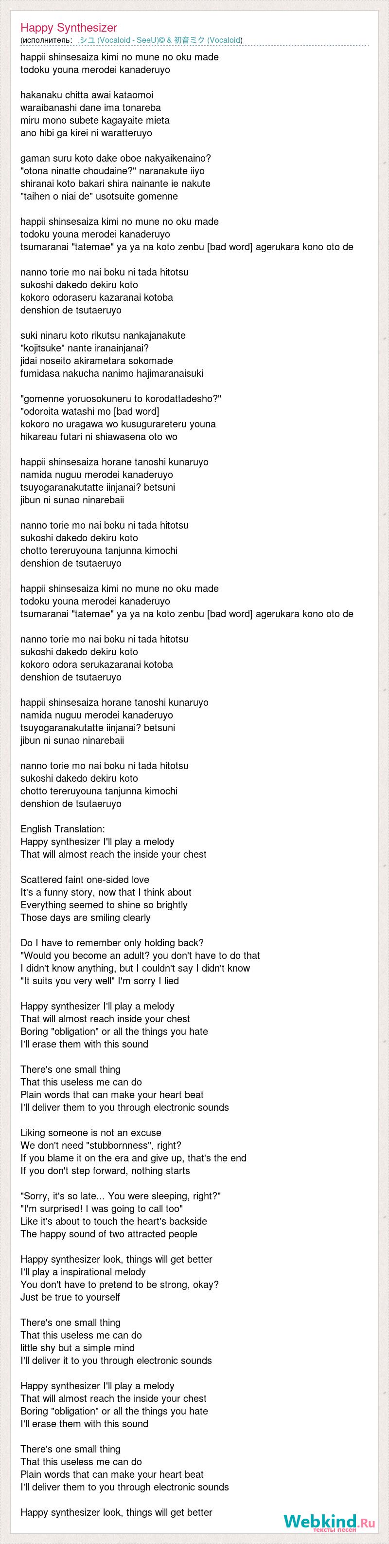 happii shinsesaiza kimi no mune no oku made todoku youna merodei kanaderuyo hakanaku chitta awai kataomoi waraibanashi dane ima tonareba miru mono subete kagayaite mieta ano hibi ga kirei ni waratteruyo gaman suru koto dake oboe nakyaikenaino? "otona ninatte choudaine?" naranakute iiyo shiranai koto bakari shira nainante ie nakute "taihen o niai de" usotsuite gomenne happii shinsesaiza kimi no mune no oku made todoku youna merodei kanaderuyo tsumaranai "tatemae" ya ya na koto zenbu [bad word] agerukara kono oto de nanno torie mo nai boku ni tada hitotsu sukoshi dakedo dekiru koto kokoro odoraseru kazaranai kotoba denshion de tsutaeruyo suki ninaru koto rikutsu nankajanakute "kojitsuke" nante iranainjanai? jidai noseito akirametara sokomade fumidasa nakucha nanimo hajimaranaisuki "gomenne yoruosokuneru to korodattadesho?" "odoroita watashi mo [bad word] kokoro no uragawa wo kusugurareteru youna hikareau futari ni shiawasena oto wo happii shinsesaiza horane tanoshi kunaruyo namida nuguu merodei kanaderuyo tsuyogaranakutatte iinjanai? betsuni jibun ni sunao ninarebaii nanno torie mo nai boku ni tada hitotsu sukoshi dakedo dekiru koto chotto tereruyouna tanjunna kimochi denshion de tsutaeruyo happii shinsesaiza kimi no mune no oku made todoku youna merodei kanaderuyo tsumaranai "tatemae" ya ya na koto zenbu [bad word] agerukara kono oto de nanno torie mo nai boku ni tada hitotsu sukoshi dakedo dekiru koto kokoro odora serukazaranai kotoba denshion de tsutaeruyo happii shinsesaiza horane tanoshi kunaruyo namida nuguu merodei kanaderuyo tsuyogaranakutatte iinjanai? betsuni jibun ni sunao ninarebaii nanno torie mo nai boku ni tada hitotsu sukoshi dakedo dekiru koto chotto tereruyouna tanjunna kimochi denshion de tsutaeruyo English Translation: Happy synthesizer I'll play a melody That will almost reach the inside your chest Scattered faint one-sided love It's a funny story, now that I think about Everything seemed to shine so brightly Those days are smiling clearly Do I have to remember only holding back? "Would you become an adult? you don't have to do that I didn't know anything, but I couldn't say I didn't know "It suits you very well" I'm sorry I lied Happy synthesizer I'll play a melody That will almost reach inside your chest Boring "obligation" or all the things you hate I'll erase them with this sound There's one small thing That this useless me can do Plain words that can make your heart beat I'll deliver them to you through electronic sounds Liking someone is not an excuse We don't need "stubbornness", right? If you blame it on the era and give up, that's the end If you don't step forward, nothing starts "Sorry, it's so late... You were sleeping, right?" "I'm surprised! I was going to call too" Like it's about to touch the heart's backside The happy sound of two attracted people Happy synthesizer look, things will get better I'll play a inspirational melody You don't have to pretend to be strong, okay? Just be true to yourself There's one small thing That this useless me can do little shy but a simple mind I'll deliver it to you through electronic sounds Happy synthesizer I'll play a melody That will almost reach the inside your chest Boring "obligation" or all the things you hate I'll erase them with this sound There's one small thing That this useless me can do Plain words that can make your heart beat I'll deliver them to you through electronic sounds Happy synthesizer look, things will get better