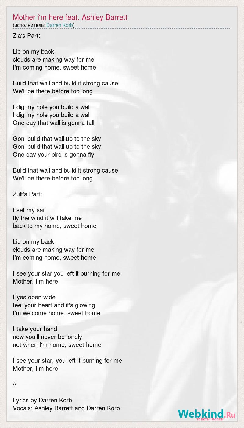 Zia's Part: Lie on my back clouds are making way for me I'm coming home, sweet home Build that wall and build it strong cause We'll be there before too long I dig my hole you build a wall I dig my hole you build a wall One day that wall is gonna fall Gon' build that wall up to the sky Gon' build that wall up to the sky One day your bird is gonna fly Build that wall and build it strong cause We'll be there before too long Zulf's Part: I set my sail fly the wind it will take me back to my home, sweet home Lie on my back clouds are making way for me I'm coming home, sweet home I see your star you left it burning for me Mother, I'm here Eyes open wide feel your heart and it's glowing I'm welcome home, sweet home I take your hand now you'll never be lonely not when I'm home, sweet home I see your star, you left it burning for me Mother, I'm here // Lyrics by Darren Korb Vocals: Ashley Barrett and Darren Korb