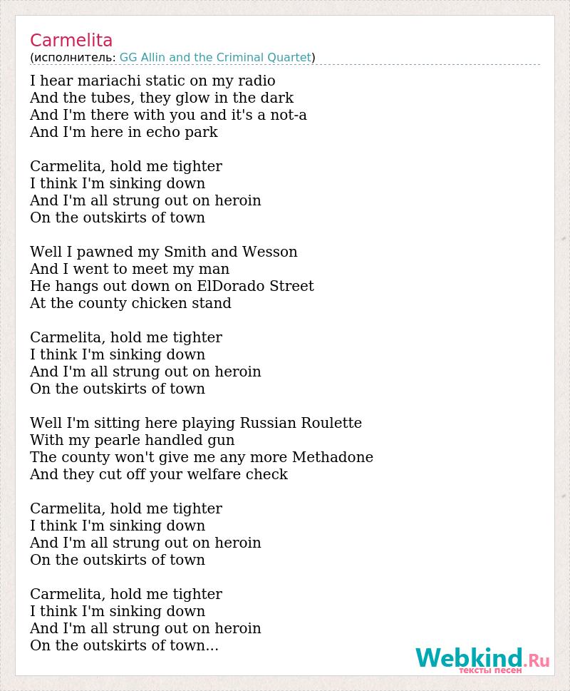 I hear mariachi static on my radio And the tubes, they glow in the dark And I'm there with you and it's a not-a And I'm here in echo park Carmelita, hold me tighter I think I'm sinking down And I'm all strung out on heroin On the outskirts of town Well I pawned my Smith and Wesson And I went to meet my man He hangs out down on ElDorado Street At the county chicken stand Carmelita, hold me tighter I think I'm sinking down And I'm all strung out on heroin On the outskirts of town Well I'm sitting here playing Russian Roulette With my pearle handled gun The county won't give me any more Methadone And they cut off your welfare check Carmelita, hold me tighter I think I'm sinking down And I'm all strung out on heroin On the outskirts of town Carmelita, hold me tighter I think I'm sinking down And I'm all strung out on heroin On the outskirts of town...