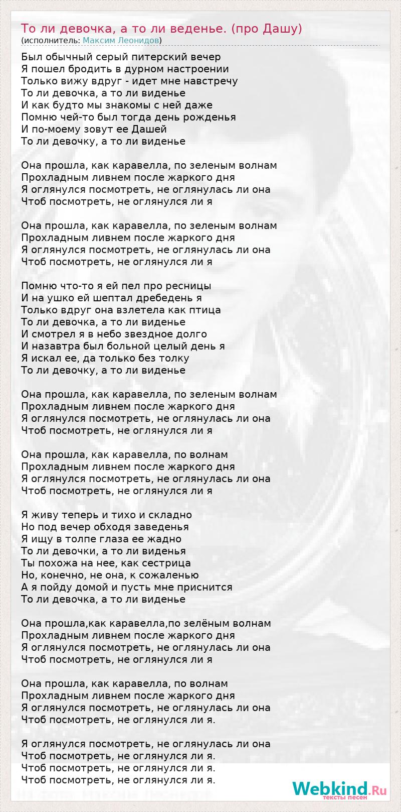 Был обычный серый питерский вечер Я пошел бродить в дурном настроении Только вижу вдруг - идет мне навстречу То ли девочка, а то ли виденье И как будто мы знакомы с ней даже Помню чей-то был тогда день рожденья И по-моему зовут ее Дашей То ли девочку, а то ли виденье Она прошла, как каравелла, по зеленым волнам Прохладным ливнем после жаркого дня Я оглянулся посмотреть, не оглянулась ли она Чтоб посмотреть, не оглянулся ли я Она прошла, как каравелла, по зеленым волнам Прохладным ливнем после жаркого дня Я оглянулся посмотреть, не оглянулась ли она Чтоб посмотреть, не оглянулся ли я Помню что-то я ей пел про ресницы И на ушко ей шептал дребедень я Только вдруг она взлетела как птица То ли девочка, а то ли виденье И смотрел я в небо звездное долго И назавтра был больной целый день я Я искал ее, да только без толку То ли девочку, а то ли виденье Она прошла, как каравелла, по зеленым волнам Прохладным ливнем после жаркого дня Я оглянулся посмотреть, не оглянулась ли она Чтоб посмотреть, не оглянулся ли я Она прошла, как каравелла, по волнам Прохладным ливнем после жаркого дня Я оглянулся посмотреть, не оглянулась ли она Чтоб посмотреть, не оглянулся ли я Я живу теперь и тихо и складно Но под вечер обходя заведенья Я ищу в толпе глаза ее жадно То ли девочки, а то ли виденья Ты похожа на нее, как сестрица Но, конечно, не она, к сожаленью А я пойду домой и пусть мне приснится То ли девочка, а то ли виденье Она прошла,как каравелла,по зелёным волнам Прохладным ливнем после жаркого дня Я оглянулся посмотреть, не оглянулась ли она Чтоб посмотреть, не оглянулся ли я Она прошла, как каравелла, по волнам Прохладным ливнем после жаркого дня Я оглянулся посмотреть, не оглянулась ли она Чтоб посмотреть, не оглянулся ли я. Я оглянулся посмотреть, не оглянулась ли она Чтоб посмотреть, не оглянулся ли я. Чтоб посмотреть, не оглянулся ли я. Чтоб посмотреть, не оглянулся ли я.
