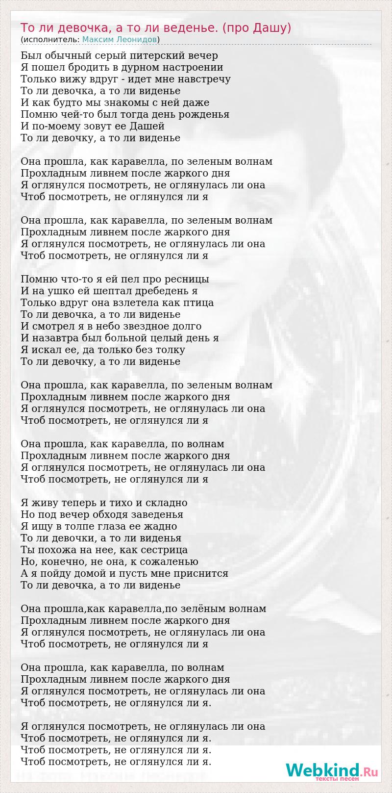 Был обычный серый питерский вечер Я пошел бродить в дурном настроении Только вижу вдруг - идет мне навстречу То ли девочка, а то ли виденье И как будто мы знакомы с ней даже Помню чей-то был тогда день рожденья И по-моему зовут ее Дашей То ли девочку, а то ли виденье Она прошла, как каравелла, по зеленым волнам Прохладным ливнем после жаркого дня Я оглянулся посмотреть, не оглянулась ли она Чтоб посмотреть, не оглянулся ли я Она прошла, как каравелла, по зеленым волнам Прохладным ливнем после жаркого дня Я оглянулся посмотреть, не оглянулась ли она Чтоб посмотреть, не оглянулся ли я Помню что-то я ей пел про ресницы И на ушко ей шептал дребедень я Только вдруг она взлетела как птица То ли девочка, а то ли виденье И смотрел я в небо звездное долго И назавтра был больной целый день я Я искал ее, да только без толку То ли девочку, а то ли виденье Она прошла, как каравелла, по зеленым волнам Прохладным ливнем после жаркого дня Я оглянулся посмотреть, не оглянулась ли она Чтоб посмотреть, не оглянулся ли я Она прошла, как каравелла, по волнам Прохладным ливнем после жаркого дня Я оглянулся посмотреть, не оглянулась ли она Чтоб посмотреть, не оглянулся ли я Я живу теперь и тихо и складно Но под вечер обходя заведенья Я ищу в толпе глаза ее жадно То ли девочки, а то ли виденья Ты похожа на нее, как сестрица Но, конечно, не она, к сожаленью А я пойду домой и пусть мне приснится То ли девочка, а то ли виденье Она прошла,как каравелла,по зелёным волнам Прохладным ливнем после жаркого дня Я оглянулся посмотреть, не оглянулась ли она Чтоб посмотреть, не оглянулся ли я Она прошла, как каравелла, по волнам Прохладным ливнем после жаркого дня Я оглянулся посмотреть, не оглянулась ли она Чтоб посмотреть, не оглянулся ли я. Я оглянулся посмотреть, не оглянулась ли она Чтоб посмотреть, не оглянулся ли я. Чтоб посмотреть, не оглянулся ли я. Чтоб посмотреть, не оглянулся ли я.