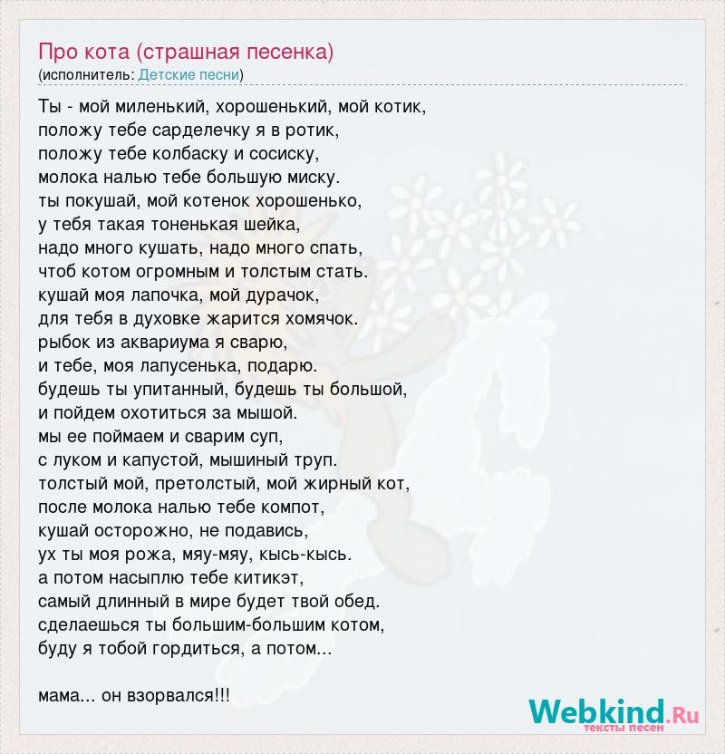 Ты - мой миленький, хорошенький, мой котик, положу тебе сарделечку я в ротик, положу тебе колбаску и сосиску, молока налью тебе большую миску. ты покушай, мой котенок хорошенько, у тебя такая тоненькая шейка, надо много кушать, надо много спать, чтоб котом огромным и толстым стать. кушай моя лапочка, мой дурачок, для тебя в духовке жарится хомячок. рыбок из аквариума я сварю, и тебе, моя лапусенька, подарю. будешь ты упитанный, будешь ты большой, и пойдем охотиться за мышой. мы ее поймаем и сварим суп, с луком и капустой, мышиный труп. толстый мой, претолстый, мой жирный кот, после молока налью тебе компот, кушай осторожно, не подавись, ух ты моя рожа, мяу-мяу, кысь-кысь. а потом насыплю тебе китикэт, самый длинный в мире будет твой обед. сделаешься ты большим-большим котом, буду я тобой гордиться, а потом... мама... он взорвался!!!