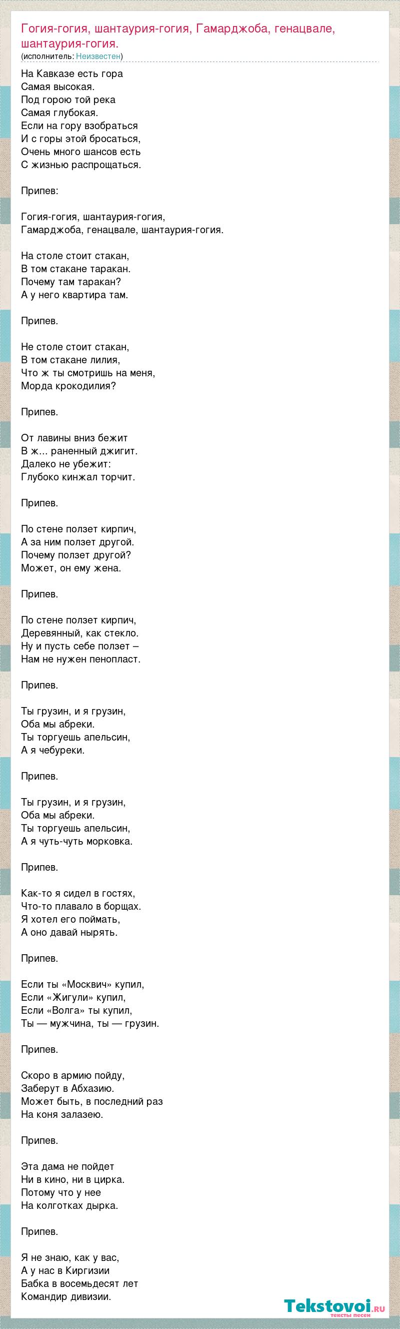 На Кавказе есть гора Самая высокая. Под горою той река Самая глубокая. Если на гору взобраться И с горы этой бросаться, Очень много шансов есть С жизнью распрощаться. Припев: Гогия-гогия, шантаурия-гогия, Гамарджоба, генацвале, шантаурия-гогия. На столе стоит стакан, В том стакане таракан. Почему там таракан? А у него квартира там. Припев. Не столе стоит стакан, В том стакане лилия, Что ж ты смотришь на меня, Морда крокодилия? Припев. От лавины вниз бежит В ж... раненный джигит. Далеко не убежит: Глубоко кинжал торчит. Припев. По стене ползет кирпич, А за ним ползет другой. Почему ползет другой? Может, он ему жена. Припев. По стене ползет кирпич, Деревянный, как стекло. Ну и пусть себе ползет – Нам не нужен пенопласт. Припев. Ты грузин, и я грузин, Оба мы абреки. Ты торгуешь апельсин, А я чебуреки. Припев. Ты грузин, и я грузин, Оба мы абреки. Ты торгуешь апельсин, А я чуть-чуть морковка. Припев. Как-то я сидел в гостях, Что-то плавало в борщах. Я хотел его поймать, А оно давай нырять. Припев. Если ты «Москвич» купил, Если «Жигули» купил, Если «Волга» ты купил, Ты — мужчина, ты — грузин. Припев. Скоро в армию пойду, Заберут в Абхазию. Может быть, в последний раз На коня залазею. Припев. Эта дама не пойдет Ни в кино, ни в цирка. Потому что у нее На колготках дырка. Припев. Я не знаю, как у вас, А у нас в Киргизии Бабка в восемьдесят лет Командир дивизии.