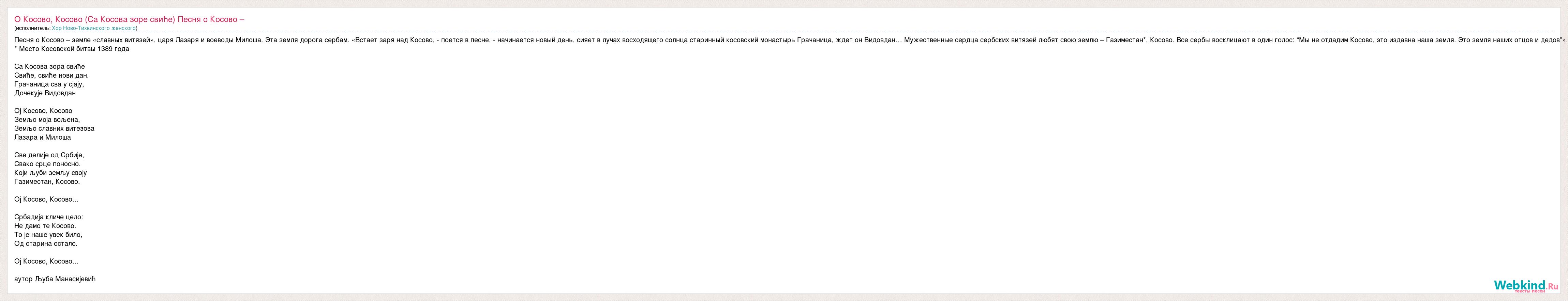 Главная→Исполнители→Хор Ново-Тихвинского женского монастыряПесня о Косово – земле «славных витязей», царя Лазаря и воеводы Милоша. Эта земля дорога сербам. «Встает заря над Косово, - поется в песне, - начинается новый день, сияет в лучах восходящего солнца старинный косовски→О Косово, Косово (Са Косова зоре свиће) Песня о Косово – земле «славных витязей»