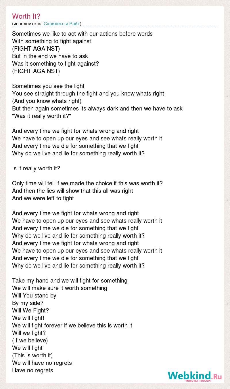 Sometimes we like to act with our actions before words With something to fight against (FIGHT AGAINST) But in the end we have to ask Was it something to fight against? (FIGHT AGAINST) Sometimes you see the light You see straight through the fight and you know whats right (And you know whats right) But then again sometimes its always dark and then we have to ask "Was it really worth it?" And every time we fight for whats wrong and right We have to open up our eyes and see whats really worth it And every time we die for something that we fight Why do we live and lie for something really worth it? Is it really worth it? Only time will tell if we made the choice if this was worth it? And then the lies will show that this all was right And we were left to fight And every time we fight for whats wrong and right We have to open up our eyes and see whats really worth it And every time we die for something that we fight Why do we live and lie for something really worth it? And every time we fight for whats wrong and right We have to open up our eyes and see whats really worth it And every time we die for something that we fight Why do we live and lie for something really worth it? Take my hand and we will fight for something We will make sure it worth something Will You stand by By my side? Will We Fight? We will fight! We will fight forever if we believe this is worth it Will we fight? (If we believe) We will fight (This is worth it) We will have no regrets Have no regrets