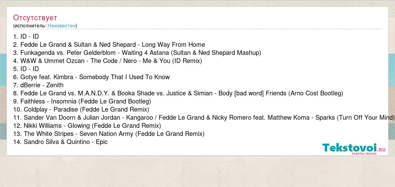 1. ID - ID 2. Fedde Le Grand & Sultan & Ned Shepard - Long Way From Home 3. Funkagenda vs. Peter Gelderblom - Waiting 4 Astana (Sultan & Ned Shepard Mashup) 4. W&W & Ummet Ozcan - The Code / Nero - Me & You (ID Remix) 5. ID - ID 6. Gotye feat. Kimbra - Somebody That I Used To Know 7. dBerrie - Zenith 8. Fedde Le Grand vs. M.A.N.D.Y. & Booka Shade vs. Justice & Simian - Body Metrum Friends (Arno Cost Bootleg) 9. Faithless - Insomnia (Fedde Le Grand Bootleg) 10. Coldplay - Paradise (Fedde Le Grand Remix) 11. Sander Van Doorn & Julian Jordan - Kangaroo / Fedde Le Grand & Nicky Romero feat. Matthew Koma - Sparks (Turn Off Your Mind) 12. Nikki Williams - Glowing (Fedde Le Grand Remix) 13. The White Stripes - Seven Nation Army (Fedde Le Grand Remix) 14. Sandro Silva & Quintino - Epic