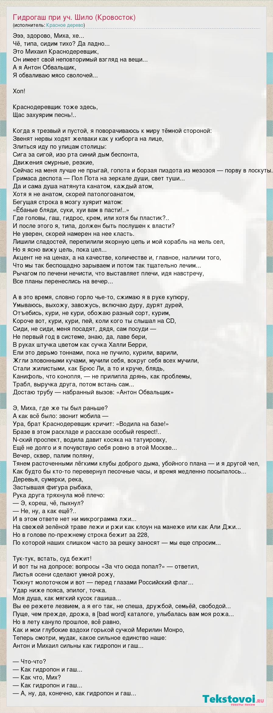 Эээ, здорово, Миха, хе... Чё, типа, сидим тихо? Да ладно... Это Михаил Краснодеревщик, Он имеет свой неповторимый взгляд на вещи... А я Антон Обвальщик, Я обваливаю мясо сволочей... Хоп! Краснодеревщик тоже здесь, Щас захуярим песнь!.. Когда я трезвый и пустой, я поворачиваюсь к миру тёмной стороной: Звенят нервы ходят желваки как у киборга на лице, Злиться иду по улицам столицы: Сига за сигой, изо рта синий дым беспонта, Движения смурные, резкие, Сейчас на меня лучше не прыгай, гопота и борзая пиздота из мезозоя — порву в лоскуты. Гримаса деспота — Пол Пота на зеркале души, свет туши... Да и сама душа натянута канатом, каждый атом, Хотя я не анатом, скорей патологоанатом, Бегущая строка в мозгу хуярит матом: «Ёбаные бляди, суки, хуи вам в пасти!..» Где головы, гаш, гидрос, крем, или хотя бы пластик?.. И после этого я, типа, должен быть послушен к власти? Не уверен, скорей намерен на нее класть. Лишили сладостей, перепилили якорную цепь и мой корабль на мель сел, Но я ясно вижу цель, пока цел... Акцент не на ценах, а на качестве, количестве и, главное, наличии того, Что мы так беспощадно зарываем и потом так тщательно лечим... Рычагом по печени нечисти, что выставляет плечи, идя навстречу, Все планы перенеслись на вечер... А в это время, словно горло чье-то, сжимаю я в руке купюру, Умываюсь, выхожу, завожусь, включаю дуру, дурят дурей, Отъебись, кури, не кури, обожаю разный сорт, курим, Короче вот, кури, кури, пей, коли кого ты слышал на CD, Сиди, не сиди, меня посадят, дядя, сам посуди — Не первый год в системе, знаю, да, лаве бери, В руках штучка цветом как сучка Халли Берри, Ели это дерьмо тоннами, пока не пучило, курили, варили, Жгли зловонными кучами, мучили себя, вокруг себя всех мучили, Стали жилистыми, как Брюс Ли, а то и круче, блядь, Канифоль, что конопля, — не прилипла дрянь, как проблемы, Трабл, выручка друга, потом встань сам... Достаю трубу — набранный вызов: «Антон Обвальщик» Э, Миха, где же ты был раньше? А как всё было: звонит мобила — Ура, брат Краснодеревщик кричит: «Водила на базе!» Бразе в этом раскладе и рассказе особый respect!.. N-ский проспект, водила давит косяка на татуировку, Ещё не долго и я почувствую себя ровно в этой Москве... Вечер, сквер, палим поляну, Тянем расточенными лёгкими клубы доброго дыма, убойного плана — и я другой чел, Как будто бы кто-то перевернул песочные часы, и время медленно посыпалось... Деревья, сумерки, река, Застывшая фигура рыбака, Рука друга тряхнула моё плечо: — Э, кореш, чё, пыхнул? — Не, ну, а как ещё?.. И в этом ответе нет ни микрограмма лжи... На свежей зелёной траве лежи и ржи как клоун на манеже или как Али Джи... Но в голове по-прежнему строка бежит за 228, По которой наших слишком часто за решку заносят — мы еще спросим... Тук-тук, встать, суд бежит! И вот ты на допросе: вопросы «За что сюда попал?» — ответил, Листья осени сделают умной рожу, Тюкнут молоточком и вот — перед глазами Российский флаг... Удар ниже пояса, эпилог, точка. Моя душа, как мягкий кусок гашиша... Вы ее режете лезвием, а я его так, не спеша, дружбой, семьёй, свободой... Пуще, чем прежде, дрожа, в [bad word] каталоге, улыбалась вам моя рожа... Но в лету кануло прошлое, всё равно, Как и мои глубокие вздохи горькой сучкой Мерилин Монро, Теперь смотри, мудак, какое сильное единство наше: Антон и Михаил сильны как гидропон и гаш... — Что-что? — Как гидропон и гаш... — Как что, Мих? — Как гидропон и гаш... — А, ну