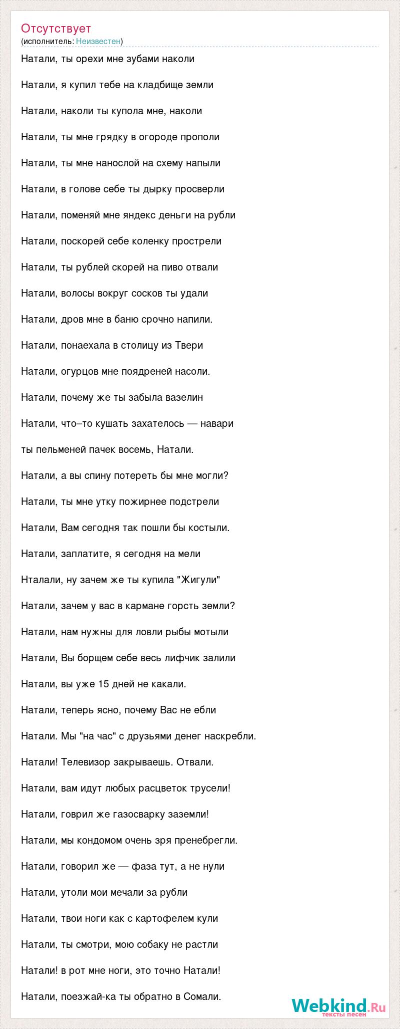 Натали, ты орехи мне зубами наколи Натали, я купил тебе на кладбище земли Натали, наколи ты купола мне, наколи Натали, ты мне грядку в огороде прополи Натали, ты мне нанослой на схему напыли Натали, в голове себе ты дырку просверли Натали, поменяй мне яндекс деньги на рубли Натали, поскорей себе коленку прострели Натали, ты рублей скорей на пиво отвали Натали, волосы вокруг сосков ты удали Натали, дров мне в баню срочно напили. Натали, понаехала в столицу из Твери Натали, огурцов мне поядреней насоли. Натали, почему же ты забыла вазелин Натали, что–то кушать захателось — навари ты пельменей пачек восемь, Натали. Натали, а вы спину потереть бы мне могли? Натали, ты мне утку пожирнее подстрели Натали, Вам сегодня так пошли бы костыли. Натали, заплатите, я сегодня на мели Нталали, ну зачем же ты купила "Жигули" Натали, зачем у вас в кармане горсть земли? Натали, нам нужны для ловли рыбы мотыли Натали, Вы борщем себе весь лифчик залили Натали, вы уже 15 дней не какали. Натали, теперь ясно, почему Вас не ебли Натали. Мы "на час" с друзьями денег наскребли. Натали! Телевизор закрываешь. Отвали. Натали, вам идут любых расцветок трусели! Натали, говрил же газосварку заземли! Натали, мы кондомом очень зря пренебрегли. Натали, говорил же — фаза тут, а не нули Натали, утоли мои мечали за рубли Натали, твои ноги как с картофелем кули Натали, ты смотри, мою собаку не растли Натали! в рот мне ноги, это точно Натали! Натали, поезжай-ка ты обратно в Сомали.