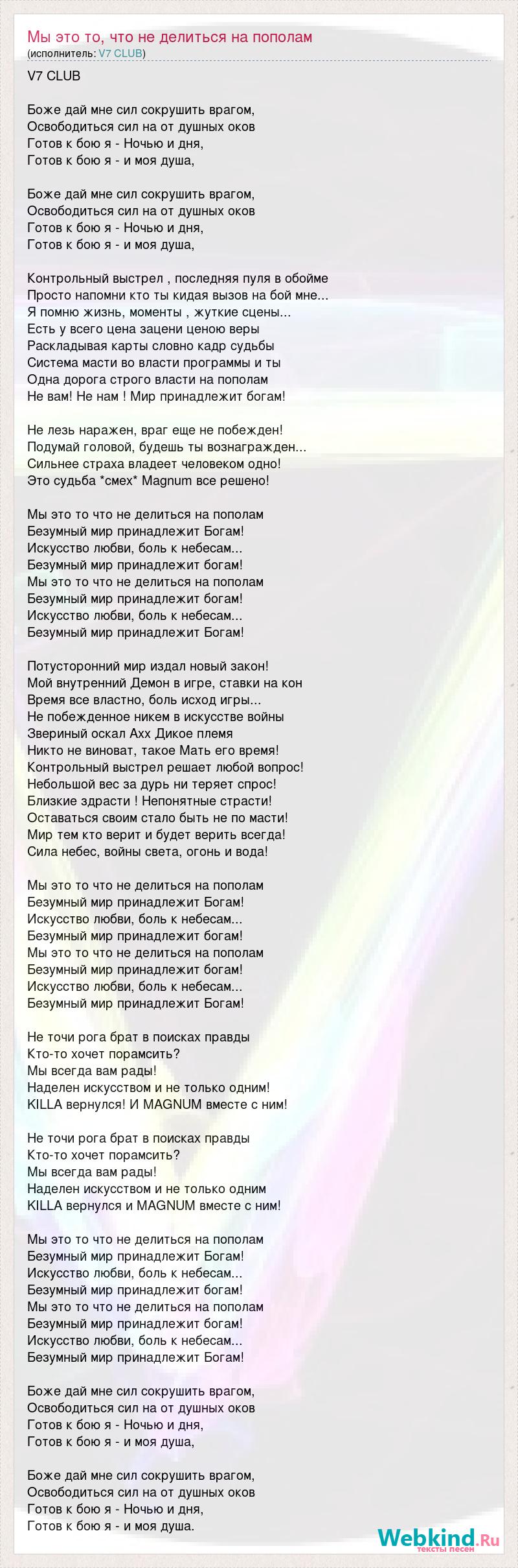 V7 CLUB Боже дай мне сил сокрушить врагом, Освободиться сил на от душных оков Готов к бою я - Ночью и дня, Готов к бою я - и моя душа, Боже дай мне сил сокрушить врагом, Освободиться сил на от душных оков Готов к бою я - Ночью и дня, Готов к бою я - и моя душа, Контрольный выстрел , последняя пуля в обойме Просто напомни кто ты кидая вызов на бой мне... Я помню жизнь, моменты , жуткие сцены... Есть у всего цена зацени ценою веры Раскладывая карты словно кадр судьбы Система масти во власти программы и ты Одна дорога строго власти на пополам Не вам! Не нам ! Мир принадлежит богам! Не лезь наражен, враг еще не побежден! Подумай головой, будешь ты вознагражден... Сильнее страха владеет человеком одно! Это судьба *смех* Magnum все решено! Мы это то что не делиться на пополам Безумный мир принадлежит Богам! Искусство любви, боль к небесам... Безумный мир принадлежит богам! Мы это то что не делиться на пополам Безумный мир принадлежит богам! Искусство любви, боль к небесам... Безумный мир принадлежит Богам! Потусторонний мир издал новый закон! Мой внутренний Демон в игре, ставки на кон Время все властно, боль исход игры... Не побежденное никем в искусстве войны Звериный оскал Ахх Дикое племя Никто не виноват, такое Мать его время! Контрольный выстрел решает любой вопрос! Небольшой вес за дурь ни теряет спрос! Близкие здрасти ! Непонятные страсти! Оставаться своим стало быть не по масти! Мир тем кто верит и будет верить всегда! Сила небес, войны света, огонь и вода! Мы это то что не делиться на пополам Безумный мир принадлежит Богам! Искусство любви, боль к небесам... Безумный мир принадлежит богам! Мы это то что не делиться на пополам Безумный мир принадлежит богам! Искусство любви, боль к небесам... Безумный мир принадлежит Богам! Не точи рога брат в поисках правды Кто-то хочет порамсить? Мы всегда вам рады! Наделен искусством и не только одним! KILLA вернулся! И MAGNUM вместе с ним! Не точи рога брат в поисках правды Кто-то хочет порамсить? Мы всегда вам рады! Наделен искусством и не только одним KILLA вернулся и MAGNUM вместе с ним! Мы это то что не делиться на пополам Безумный мир принадлежит Богам! Искусство любви, боль к небесам... Безумный мир принадлежит богам! Мы это то что не делиться на пополам Безумный мир принадлежит богам! Искусство любви, боль к небесам... Безумный мир принадлежит Богам! Боже дай мне сил сокрушить врагом, Освободиться сил на от душных оков Готов к бою я - Ночью и дня, Готов к бою я - и моя душа, Боже дай мне сил сокрушить врагом, Освободиться сил на от душных оков Готов к бою я - Ночью и дня, Готов к бою я - и моя душа.