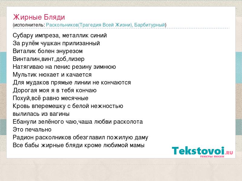 Субару импреза, металлик синий За рулём чушкан прилизанный Виталик болен энурезом Винталин,винт,доб,лизер Натягиваю на пенис резину зимнюю Мультик нюхает и качается Для мудаков прямые линии не кончаются Дорогая моя я в тебя кончаю Похуй,всё равно месячные Кровь вперемешку с белой нежностью вылилась из вагины Ебанули зелёного чаю,чаша любви расколота Это печально Радион расколников обезглавил пожилую даму Все бабы жирные бляди кроме любимой мамы