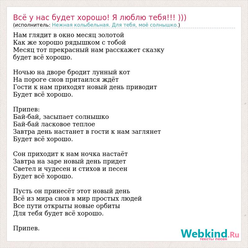 Нам глядит в окно месяц золотой Как же хорошо рядышком с тобой Месяц тот прекрасный нам расскажет сказку будет всё хорошо. Ночью на дворе бродит лунный кот На пороге снов притаился ждёт Гости к нам приходят новый день приводит Будет всё хорошо. Припев: Бай-бай, засыпает солнышко Бай-бай ласковое теплое Завтра день настанет в гости к нам заглянет Будет всё хорошо. Сон приходит к нам ночка настаёт Завтра на заре новый день придет Светел и чудесен и стихов и песен Будет всё хорошо. Пусть он принесёт этот новый день Всё из мира снов в мир простых людей Все пути открыты новые орбиты Для тебя будет всё хорошо. Припев.
