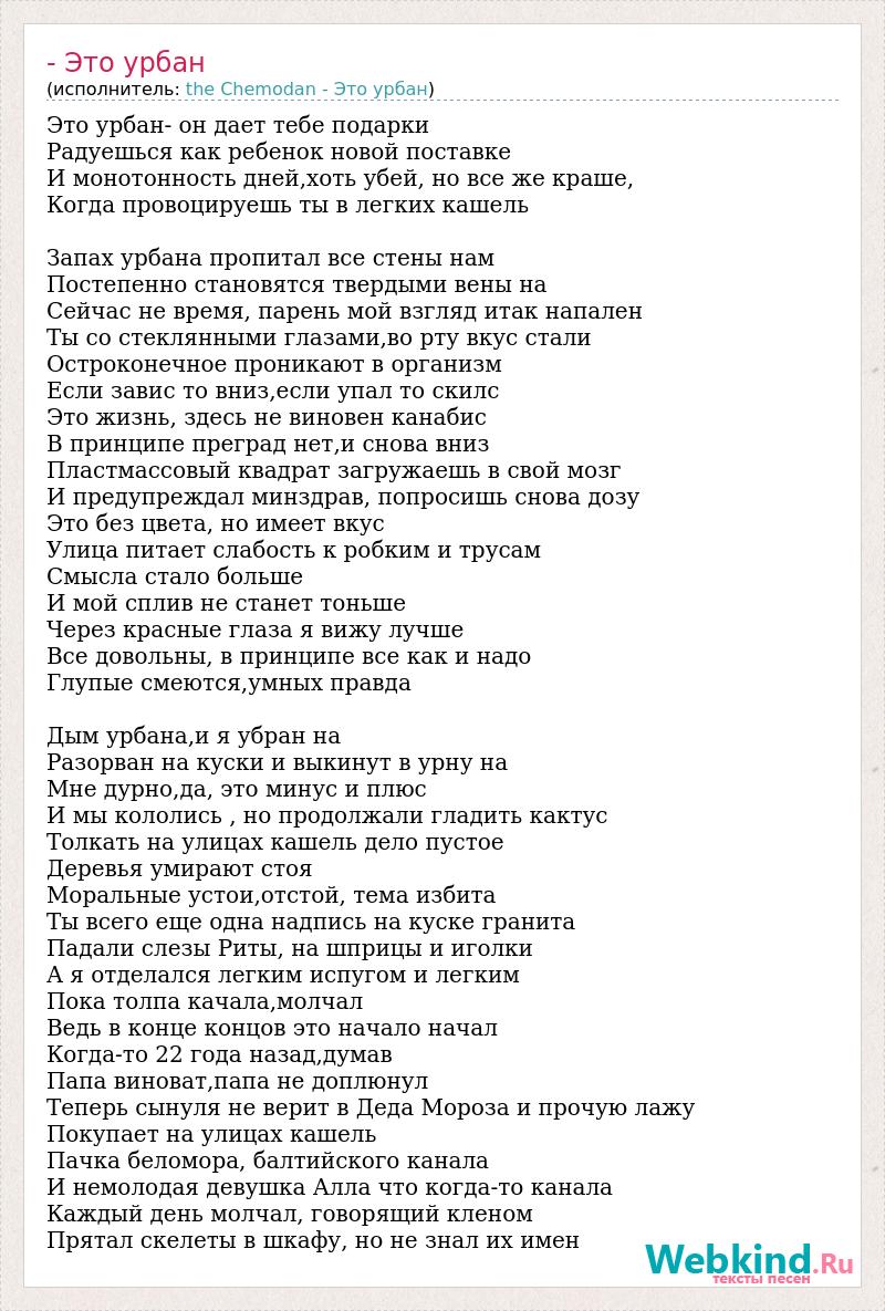 Это урбан- он дает тебе подарки Радуешься как ребенок новой поставке И монотонность дней,хоть убей, но все же краше, Когда провоцируешь ты в легких кашель Запах урбана пропитал все стены нам Постепенно становятся твердыми вены на Сейчас не время, парень мой взгляд итак напален Ты со стеклянными глазами,во рту вкус стали Остроконечное проникают в организм Если завис то вниз,если упал то скилс Это жизнь, здесь не виновен канабис В принципе преград нет,и снова вниз Пластмассовый квадрат загружаешь в свой мозг И предупреждал минздрав, попросишь снова дозу Это без цвета, но имеет вкус Улица питает слабость к робким и трусам Смысла стало больше И мой сплив не станет тоньше Через красные глаза я вижу лучше Все довольны, в принципе все как и надо Глупые смеются,умных правда Дым урбана,и я убран на Разорван на куски и выкинут в урну на Мне дурно,да, это минус и плюс И мы кололись , но продолжали гладить кактус Толкать на улицах кашель дело пустое Деревья умирают стоя Моральные устои,отстой, тема избита Ты всего еще одна надпись на куске гранита Падали слезы Риты, на шприцы и иголки А я отделался легким испугом и легким Пока толпа качала,молчал Ведь в конце концов это начало начал Когда-то 22 года назад,думав Папа виноват,папа не доплюнул Теперь сынуля не верит в Деда Мороза и прочую лажу Покупает на улицах кашель Пачка беломора, балтийского канала И немолодая девушка Алла что когда-то канала Каждый день молчал, говорящий кленом Прятал скелеты в шкафу, но не знал их имен