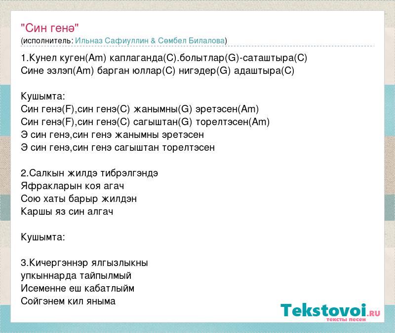 1.Кунел куген(Am) каплаганда(C).болытлар(G)-саташтыра(C) Сине эзлэп(Am) барган юллар(C) нигэдер(G) адаштыра(C) Кушымта: Син генэ(F),син генэ(C) жанымны(G) эретэсен(Am) Син генэ(F),син генэ(C) сагыштан(G) торелтэсен(Am) Э син генэ,син генэ жанымны эретэсен Э син генэ,син генэ сагыштан торелтэсен 2.Салкын жилдэ тибрэлгэндэ Яфракларын коя агач Сою хаты барыр жилдэн Каршы яз син алгач Кушымта: 3.Кичергэннэр ялгызлыкны упкыннарда тайпылмый Исеменне еш кабатлыйм Сойгэнем кил яныма