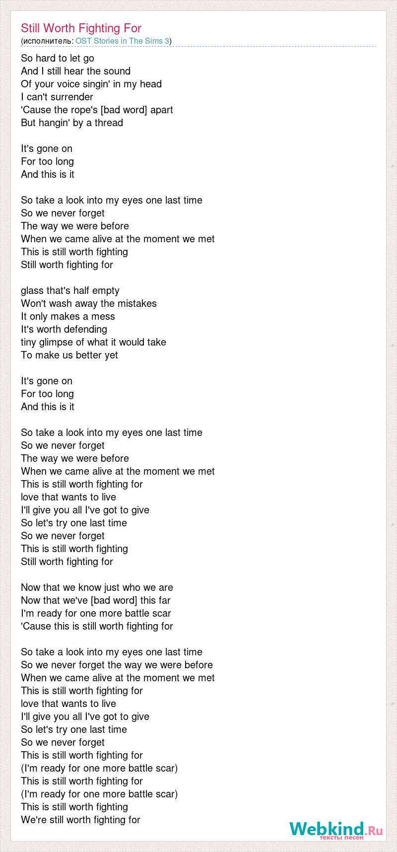 So hard to let go And I still hear the sound Of your voice singin' in my head I can't surrender 'Cause the rope's [bad word] apart But hangin' by a thread It's gone on For too long And this is it So take a look into my eyes one last time So we never forget The way we were before When we came alive at the moment we met This is still worth fighting Still worth fighting for glass that's half empty Won't wash away the mistakes It only makes a mess It's worth defending tiny glimpse of what it would take To make us better yet It's gone on For too long And this is it So take a look into my eyes one last time So we never forget The way we were before When we came alive at the moment we met This is still worth fighting for love that wants to live I'll give you all I've got to give So let's try one last time So we never forget This is still worth fighting Still worth fighting for Now that we know just who we are Now that we've [bad word] this far I'm ready for one more battle scar 'Cause this is still worth fighting for So take a look into my eyes one last time So we never forget the way we were before When we came alive at the moment we met This is still worth fighting for love that wants to live I'll give you all I've got to give So let's try one last time So we never forget This is still worth fighting for (I'm ready for one more battle scar) This is still worth fighting for (I'm ready for one more battle scar) This is still worth fighting We're still worth fighting for