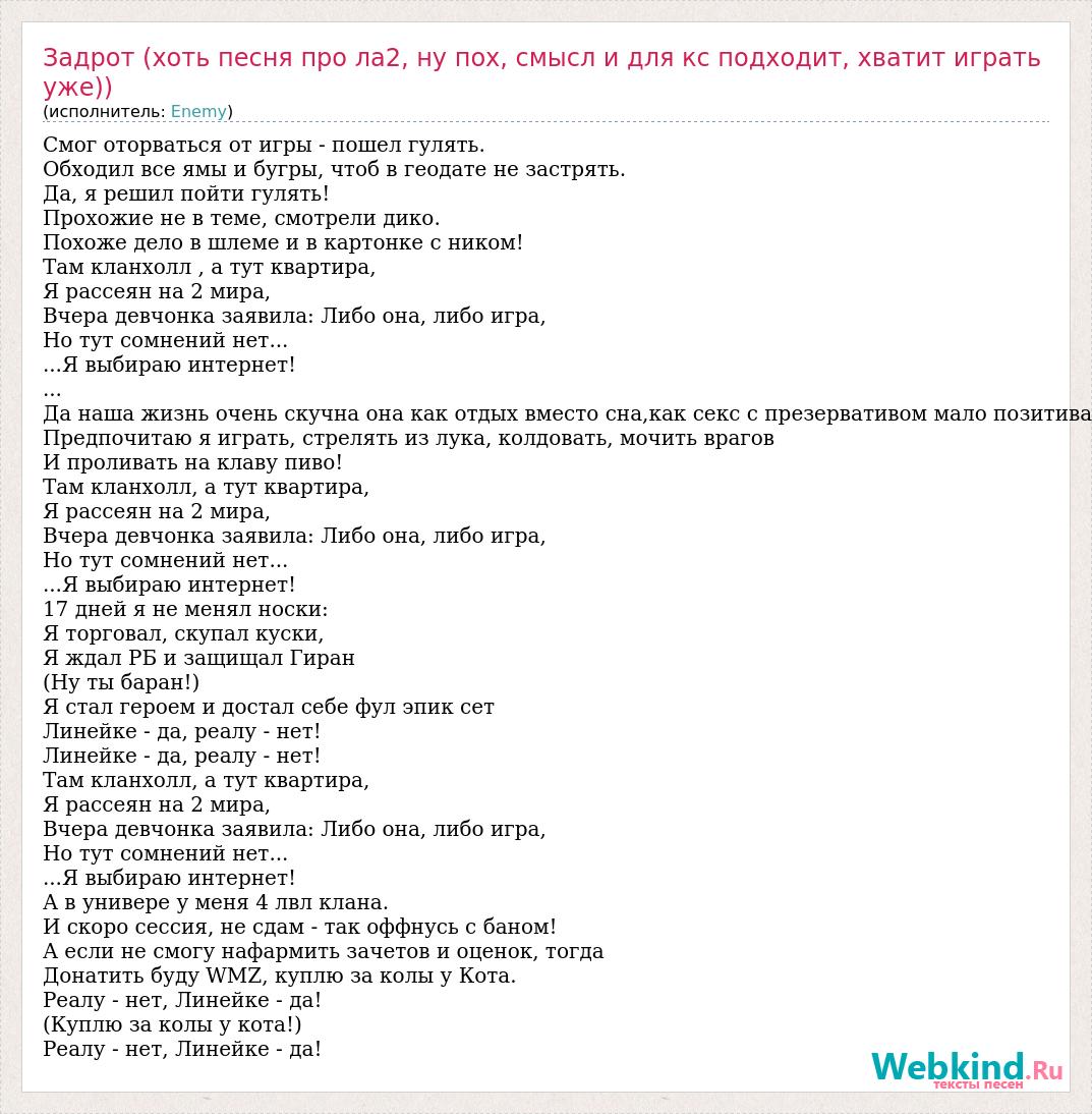 Смог оторваться от игры - пошел гулять. Обходил все ямы и бугры, чтоб в геодате не застрять. Да, я решил пойти гулять! Прохожие не в теме, смотрели дико. Похоже дело в шлеме и в картонке с ником! Там кланхолл , а тут квартира, Я рассеян на 2 мира, Вчера девчонка заявила: Либо она, либо игра, Но тут сомнений нет... ...Я выбираю интернет! ... Да наша жизнь очень скучна она как отдых вместо сна,как секс с презервативом мало позитива Предпочитаю я играть, стрелять из лука, колдовать, мочить врагов И проливать на клаву пиво! Там кланхолл, а тут квартира, Я рассеян на 2 мира, Вчера девчонка заявила: Либо она, либо игра, Но тут сомнений нет... ...Я выбираю интернет! 17 дней я не менял носки: Я торговал, скупал куски, Я ждал РБ и защищал Гиран (Ну ты баран!) Я стал героем и достал себе фул эпик сет Линейке - да, реалу - нет! Линейке - да, реалу - нет! Там кланхолл, а тут квартира, Я рассеян на 2 мира, Вчера девчонка заявила: Либо она, либо игра, Но тут сомнений нет... ...Я выбираю интернет! А в универе у меня 4 лвл клана. И скоро сессия, не сдам - так оффнусь с баном! А если не смогу нафармить зачетов и оценок, тогда Донатить буду WMZ, куплю за колы у Кота. Реалу - нет, Линейке - да! (Куплю за колы у кота!) Реалу - нет, Линейке - да!