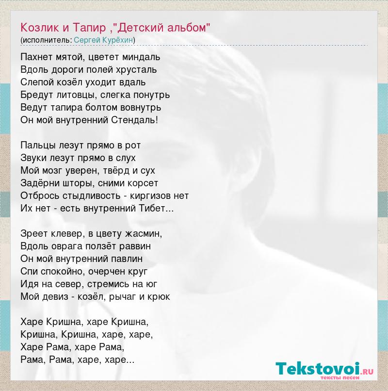 Пахнет мятой, цветет миндаль Вдоль дороги полей хрусталь Слепой козёл уходит вдаль Бредут литовцы, слегка понутрь Ведут тапира болтом вовнутрь Он мой внутренний Стендаль! Пальцы лезут прямо в рот Звуки лезут прямо в слух Мой мозг уверен, твёрд и сух Задёрни шторы, сними корсет Отбрось стыдливость - киргизов нет Их нет - есть внутренний Тибет... Зреет клевер, в цвету жасмин, Вдоль оврага ползёт раввин Он мой внутренний павлин Спи спокойно, очерчен круг Идя на север, стремись на юг Мой девиз - козёл, рычаг и крюк Харе Кришна, харе Кришна, Кришна, Кришна, харе, харе, Харе Рама, харе Рама, Рама, Рама, харе, харе...