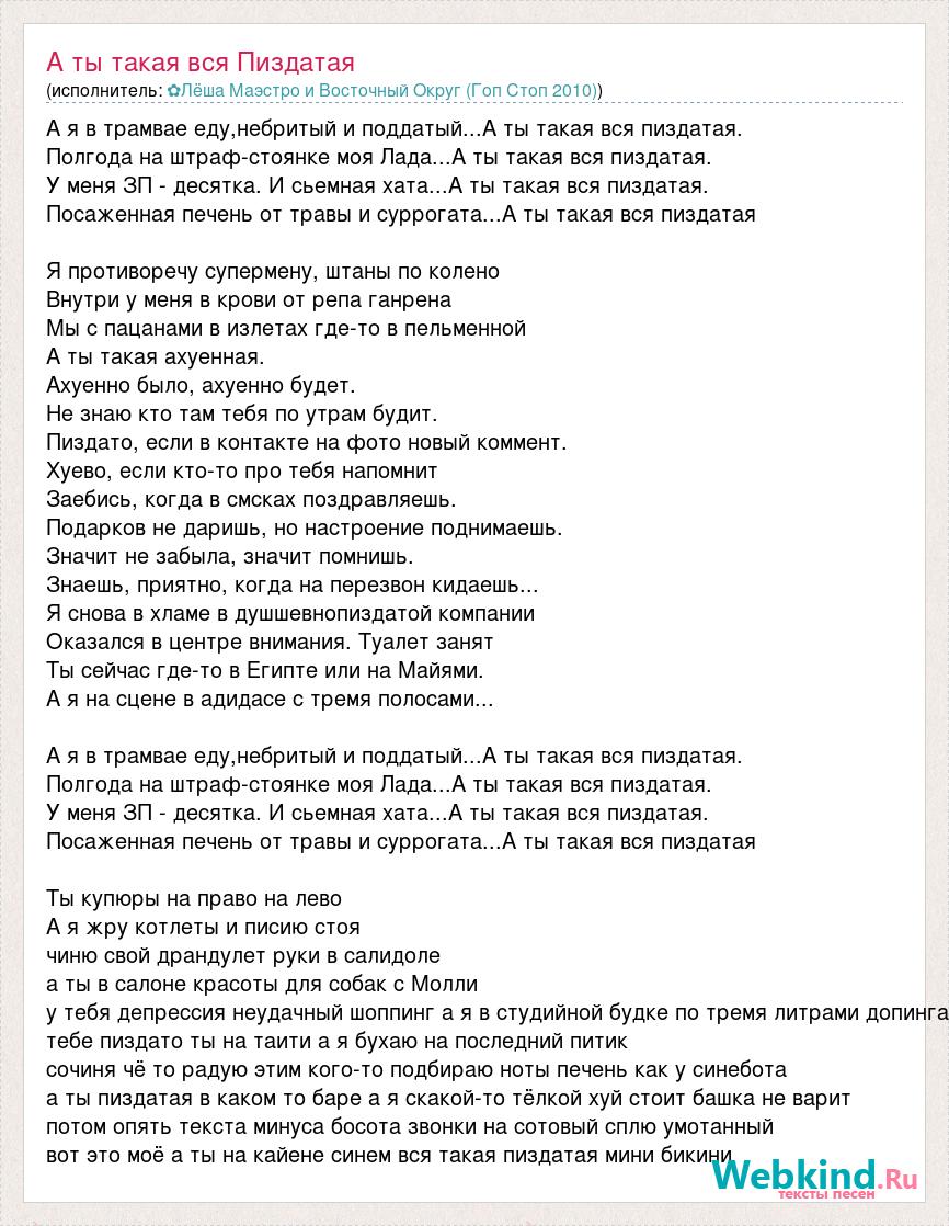 А я в трамвае еду,небритый и поддатый...А ты такая вся пиздатая. Полгода на штраф-стоянке моя Лада...А ты такая вся пиздатая. У меня ЗП - десятка. И сьемная хата...А ты такая вся пиздатая. Посаженная печень от травы и суррогата...А ты такая вся пиздатая Я противоречу супермену, штаны по колено Внутри у меня в крови от репа ганрена Мы с пацанами в излетах где-то в пельменной А ты такая ахуенная. Ахуенно было, ахуенно будет. Не знаю кто там тебя по утрам будит. Пиздато, если в контакте на фото новый коммент. Хуево, если кто-то про тебя напомнит Заебись, когда в смсках поздравляешь. Подарков не даришь, но настроение поднимаешь. Значит не забыла, значит помнишь. Знаешь, приятно, когда на перезвон кидаешь... Я снова в хламе в душшевнопиздатой компании Оказался в центре внимания. Туалет занят Ты сейчас где-то в Египте или на Майями. А я на сцене в адидасе с тремя полосами... А я в трамвае еду,небритый и поддатый...А ты такая вся пиздатая. Полгода на штраф-стоянке моя Лада...А ты такая вся пиздатая. У меня ЗП - десятка. И сьемная хата...А ты такая вся пиздатая. Посаженная печень от травы и суррогата...А ты такая вся пиздатая Ты купюры на право на лево А я жру котлеты и писию стоя чиню свой драндулет руки в салидоле а ты в салоне красоты для собак с Молли у тебя депрессия неудачный шоппинг а я в студийной будке по тремя литрами допинга тебе пиздато ты на таити а я бухаю на последний питик сочиня чё то радую этим кого-то подбираю ноты печень как у синебота а ты пиздатая в каком то баре а я скакой-то тёлкой хуй стоит башка не варит потом опять текста минуса босота звонки на сотовый сплю умотанный вот это моё а ты на кайене синем вся такая пиздатая мини бикини