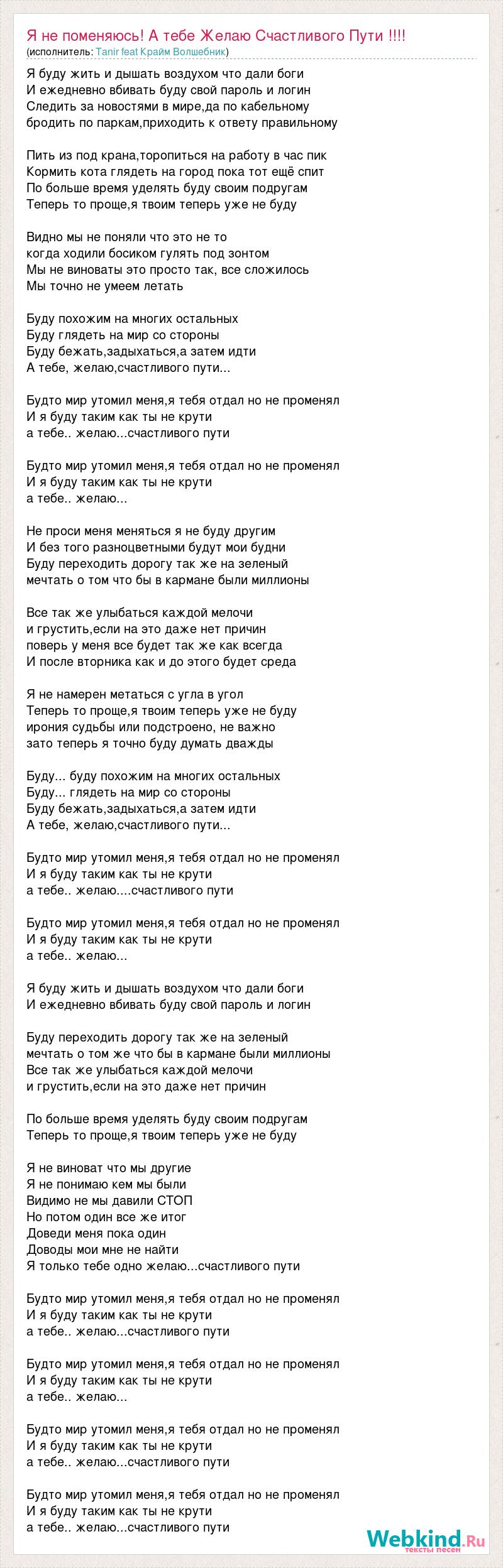 Я буду жить и дышать воздухом что дали боги И ежедневно вбивать буду свой пароль и логин Следить за новостями в мире,да по кабельному бродить по паркам,приходить к ответу правильному Пить из под крана,торопиться на работу в час пик Кормить кота глядеть на город пока тот ещё спит По больше время уделять буду своим подругам Теперь то проще,я твоим теперь уже не буду Видно мы не поняли что это не то когда ходили босиком гулять под зонтом Мы не виноваты это просто так, все сложилось Мы точно не умеем летать Буду похожим на многих остальных Буду глядеть на мир со стороны Буду бежать,задыхаться,а затем идти А тебе, желаю,счастливого пути... Будто мир утомил меня,я тебя отдал но не променял И я буду таким как ты не крути а тебе.. желаю...счастливого пути Будто мир утомил меня,я тебя отдал но не променял И я буду таким как ты не крути а тебе.. желаю... Не проси меня меняться я не буду другим И без того разноцветными будут мои будни Буду переходить дорогу так же на зеленый мечтать о том что бы в кармане были миллионы Все так же улыбаться каждой мелочи и грустить,если на это даже нет причин поверь у меня все будет так же как всегда И после вторника как и до этого будет среда Я не намерен метаться с угла в угол Теперь то проще,я твоим теперь уже не буду ирония судьбы или подстроено, не важно зато теперь я точно буду думать дважды Буду... буду похожим на многих остальных Буду... глядеть на мир со стороны Буду бежать,задыхаться,а затем идти А тебе, желаю,счастливого пути... Будто мир утомил меня,я тебя отдал но не променял И я буду таким как ты не крути а тебе.. желаю....счастливого пути Будто мир утомил меня,я тебя отдал но не променял И я буду таким как ты не крути а тебе.. желаю... Я буду жить и дышать воздухом что дали боги И ежедневно вбивать буду свой пароль и логин Буду переходить дорогу так же на зеленый мечтать о том же что бы в кармане были миллионы Все так же улыбаться каждой мелочи и грустить,если на это даже нет причин По больше время уделять буду своим подругам Теперь то проще,я твоим теперь уже не буду Я не виноват что мы другие Я не понимаю кем мы были Видимо не мы давили СТОП Но потом один все же итог Доведи меня пока один Доводы мои мне не найти Я только тебе одно желаю...счастливого пути Будто мир утомил меня,я тебя отдал но не променял И я буду таким как ты не крути а тебе.. желаю...счастливого пути Будто мир утомил меня,я тебя отдал но не променял И я буду таким как ты не крути а тебе.. желаю... Будто мир утомил меня,я тебя отдал но не променял И я буду таким как ты не крути а тебе.. желаю...счастливого пути Будто мир утомил меня,я тебя отдал но не променял И я буду таким как ты не крути а тебе.. желаю...счастливого пути