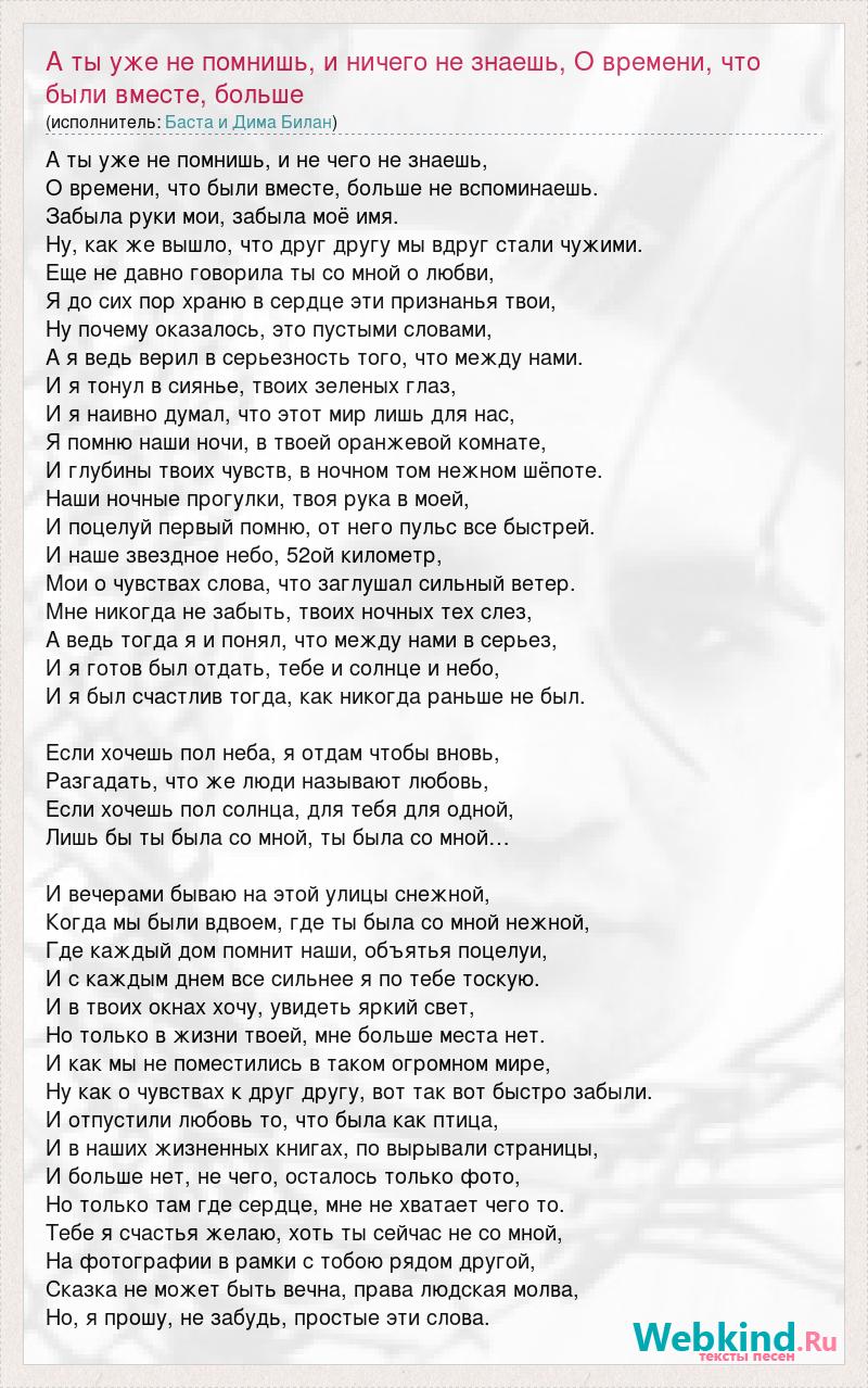 Главная→Исполнители→Баста И Дима Билан→А ты уже не помнишь, и ничего не знаешь, О времени, что были вместе, б