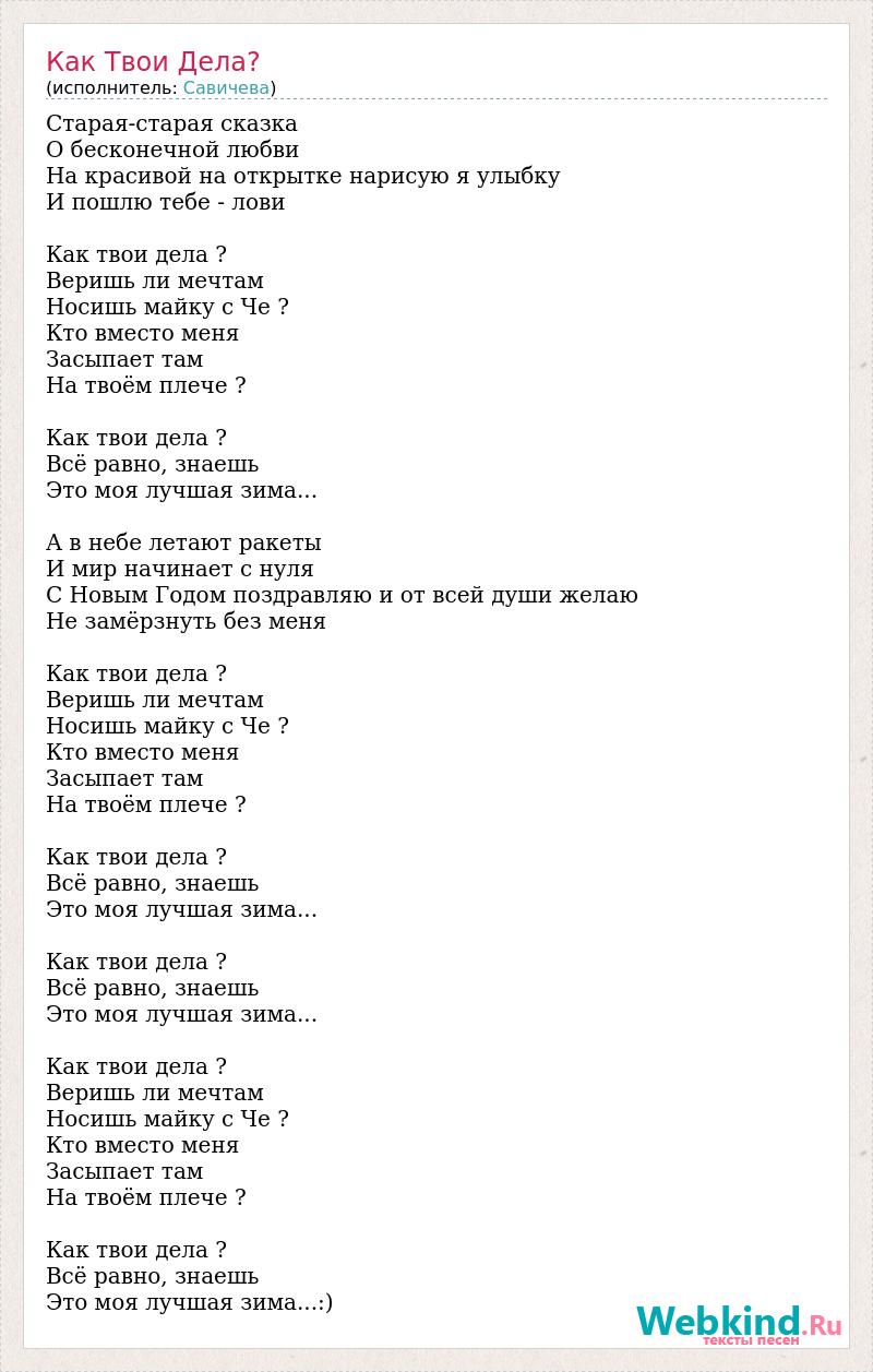 Старая-старая сказка О бесконечной любви На красивой на открытке нарисую я улыбку И пошлю тебе - лови Как твои дела ? Веришь ли мечтам Носишь майку с Че ? Кто вместо меня Засыпает там На твоём плече ? Как твои дела ? Всё равно, знаешь Это моя лучшая зима... А в небе летают ракеты И мир начинает с нуля С Новым Годом поздравляю и от всей души желаю Не замёрзнуть без меня Как твои дела ? Веришь ли мечтам Носишь майку с Че ? Кто вместо меня Засыпает там На твоём плече ? Как твои дела ? Всё равно, знаешь Это моя лучшая зима... Как твои дела ? Всё равно, знаешь Это моя лучшая зима... Как твои дела ? Веришь ли мечтам Носишь майку с Че ? Кто вместо меня Засыпает там На твоём плече ? Как твои дела ? Всё равно, знаешь Это моя лучшая зима...:)