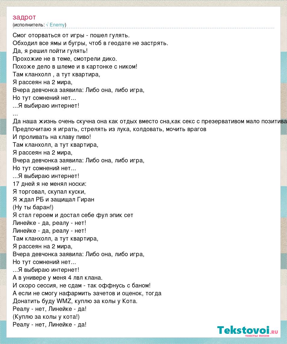 Смог оторваться от игры - пошел гулять. Обходил все ямы и бугры, чтоб в геодате не застрять. Да, я решил пойти гулять! Прохожие не в теме, смотрели дико. Похоже дело в шлеме и в картонке с ником! Там кланхолл , а тут квартира, Я рассеян на 2 мира, Вчера девчонка заявила: Либо она, либо игра, Но тут сомнений нет... ...Я выбираю интернет! ... Да наша жизнь очень скучна она как отдых вместо сна,как секс с презервативом мало позитива Предпочитаю я играть, стрелять из лука, колдовать, мочить врагов И проливать на клаву пиво! Там кланхолл, а тут квартира, Я рассеян на 2 мира, Вчера девчонка заявила: Либо она, либо игра, Но тут сомнений нет... ...Я выбираю интернет! 17 дней я не менял носки: Я торговал, скупал куски, Я ждал РБ и защищал Гиран (Ну ты баран!) Я стал героем и достал себе фул эпик сет Линейке - да, реалу - нет! Линейке - да, реалу - нет! Там кланхолл, а тут квартира, Я рассеян на 2 мира, Вчера девчонка заявила: Либо она, либо игра, Но тут сомнений нет... ...Я выбираю интернет! А в универе у меня 4 лвл клана. И скоро сессия, не сдам - так оффнусь с баном! А если не смогу нафармить зачетов и оценок, тогда Донатить буду WMZ, куплю за колы у Кота. Реалу - нет, Линейке - да! (Куплю за колы у кота!) Реалу - нет, Линейке - да!